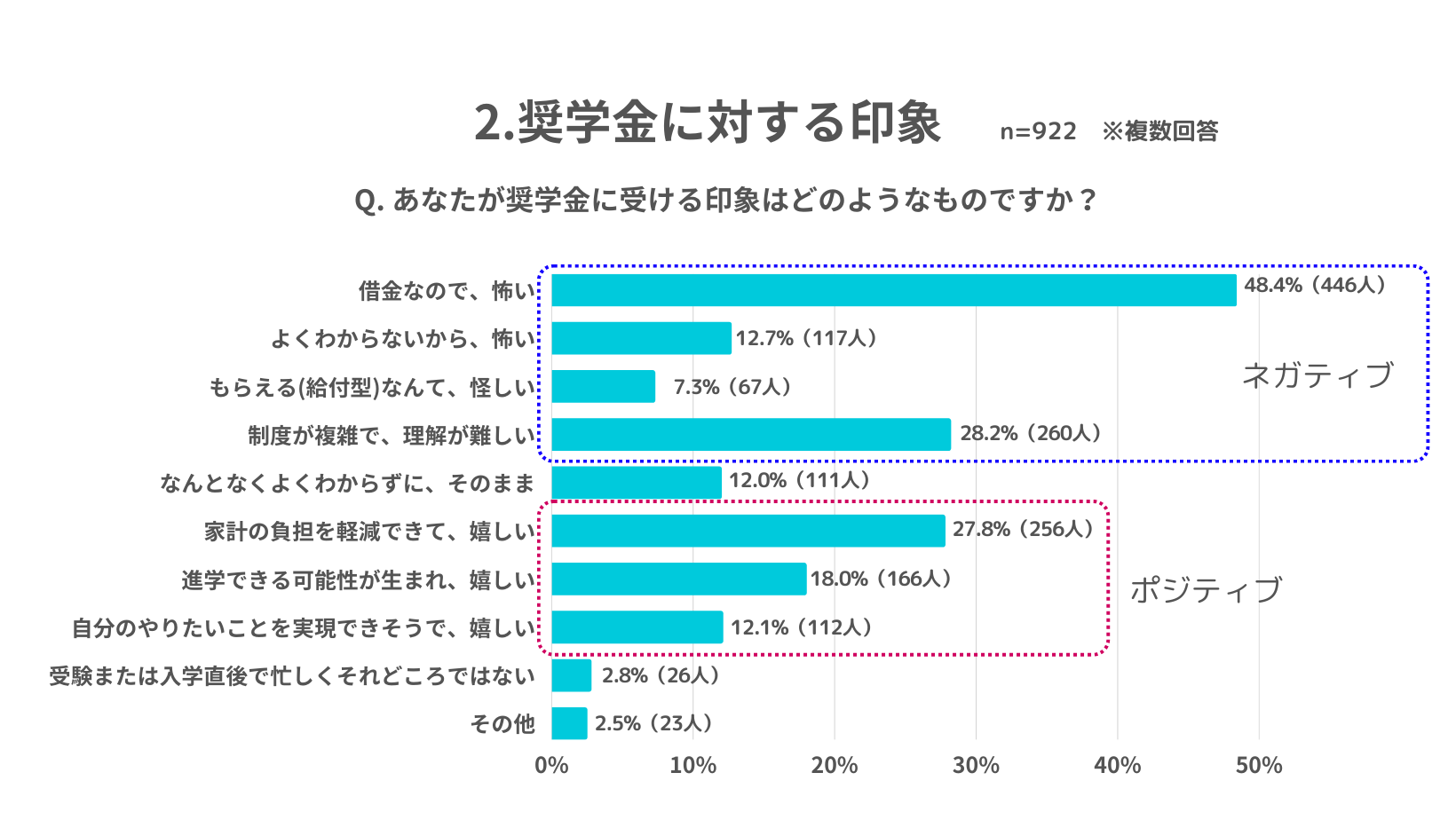 2.【奨学金に対する印象】全体の約半数が「借金なので怖い」と回答、非受給の学生では約7割にものぼる。ネガティブな印象がポジティブな印象を上回る結果に。奨学金に対する偏った印象が奨学金活用へのハードルになっている可能性も