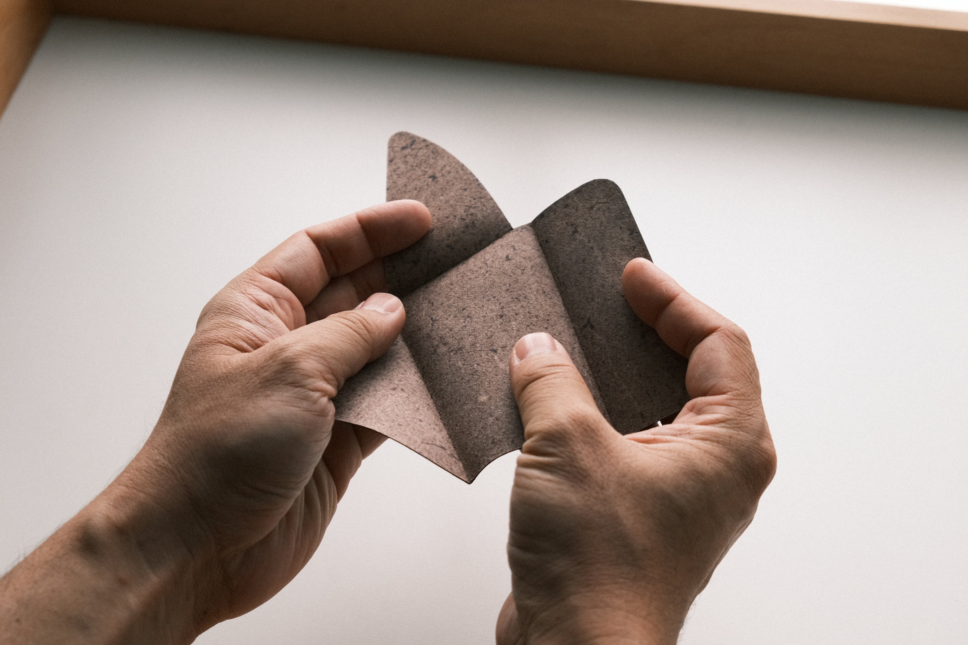 国内のタンナー・漉割職人の手を経て生まれた紙のように薄い革を使用。そのままだと柔らかくて整形できない革を、特殊な裏処理加工を施すことで、パリッと張りのある上質に仕上げています。