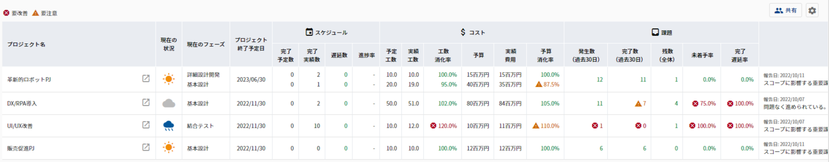 複数のプロジェクトをマネジメントする際、プロジェクトの問題を早期に検知・解決するためには、マネジメントメンバーが各プロジェクトの最新状況を正しく把握しておく必要があります。
