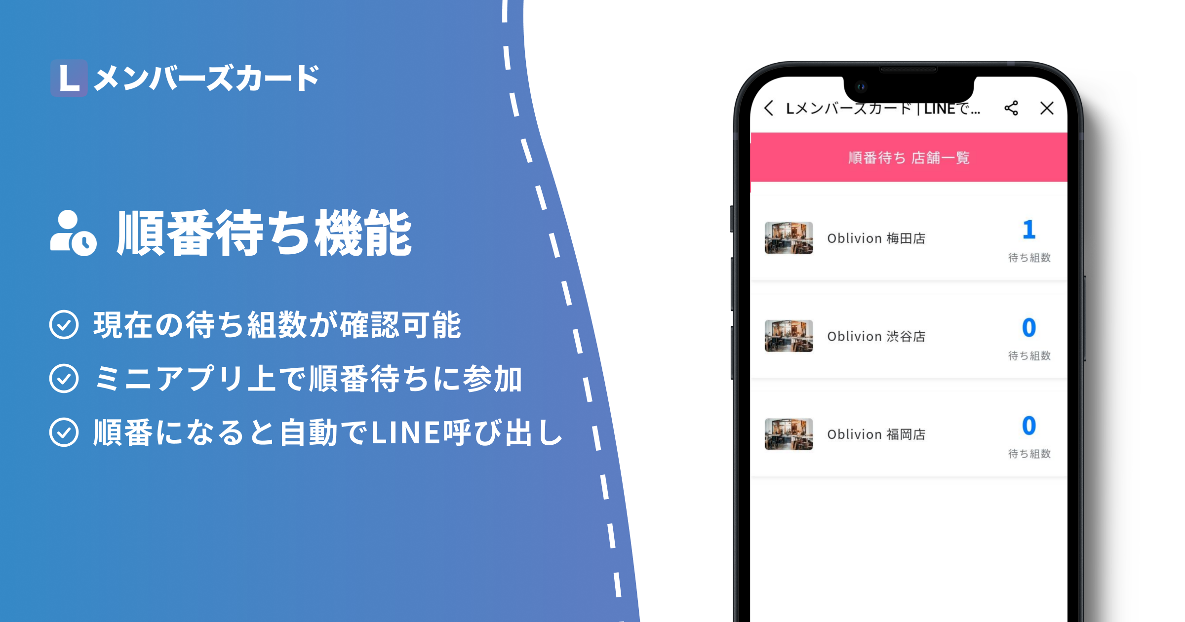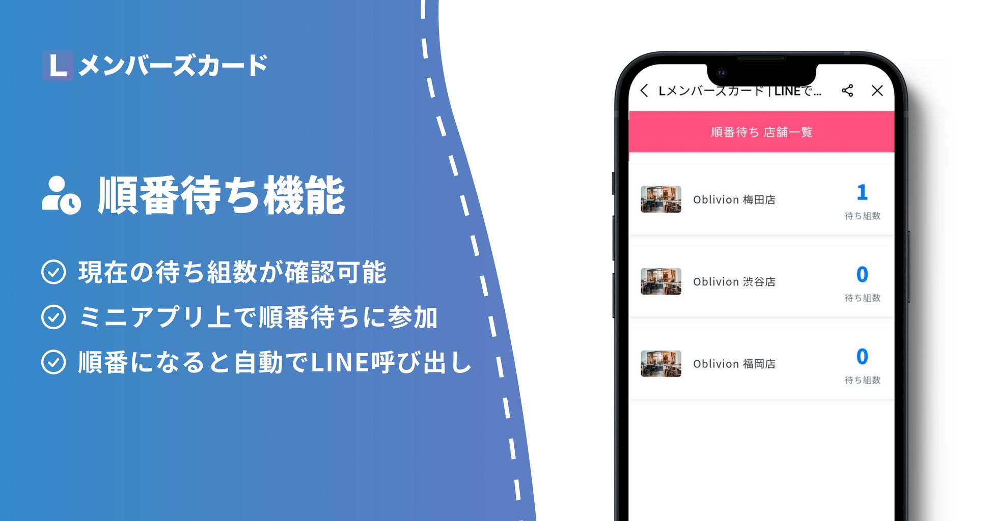 合同会社Oblivion(所在地:東京都千代田区平河町1-6-15、代表取締役社長:佐藤日出輝、以下Oblivion)が提供する、会員登録や会員証の提示をスムーズにし、多くの業種に対応する豊富な拡張機能を持った「Lメンバーズカード」(https://www.l-members.me/lp/miniapp)が、新たに「順番待ち機能」をリリースいたしました。