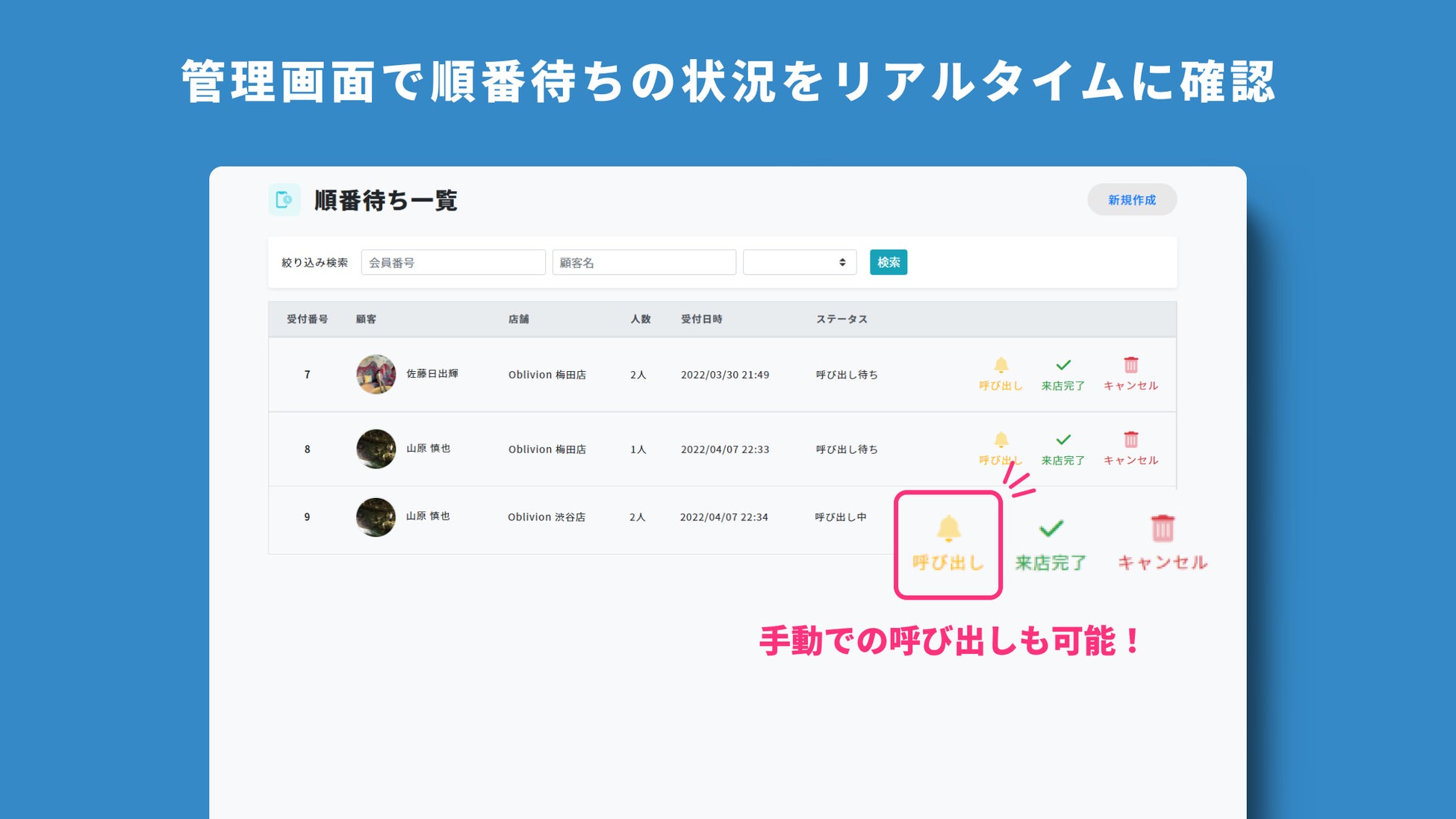 「順番待ち機能」の管理画面には、順番待ちの受付状況がリアルタイムで反映されます。受付人数や受付日時を一目で確認できるだけでなく、ボタンを使用して手動でお客様を呼び出すことも可能です。