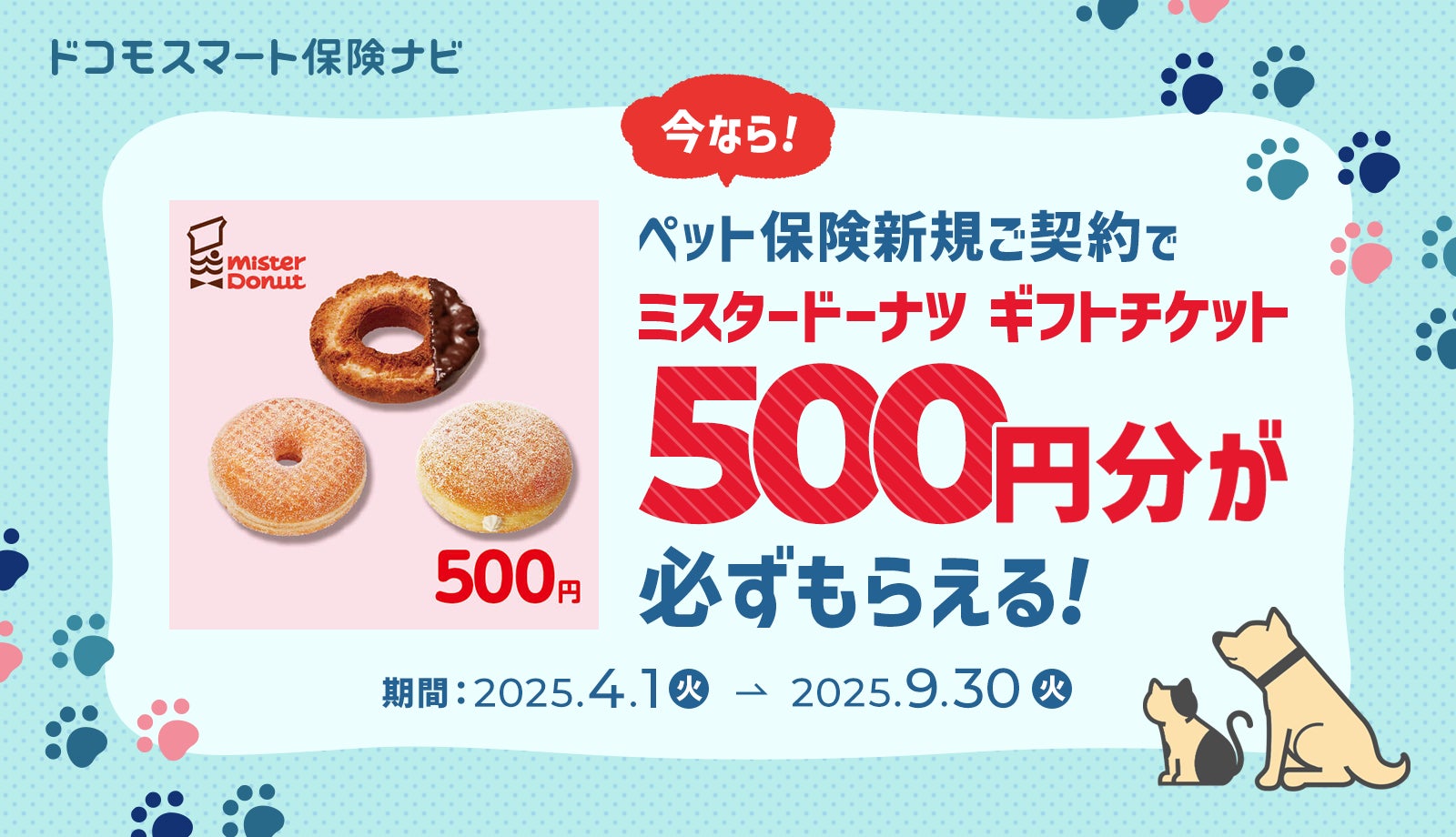 期間中にドコモスマート保険ナビを通じてペット保険を新規でご契約された方に、もれなくミスタードーナツ ギフトチケット(500円)をプレゼントいたします。