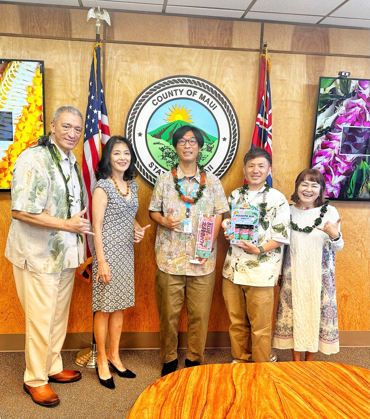写真左から、マウイ郡長:リチャード・T・ビッセン様、通訳:KYOKO KIMURA 様、株式会社マップトラベル 代表取締役 大道哲平、同社 常務取締役 疋田 賢士 、ハワイ福井県人会 会長 深草 しのぶ 様
