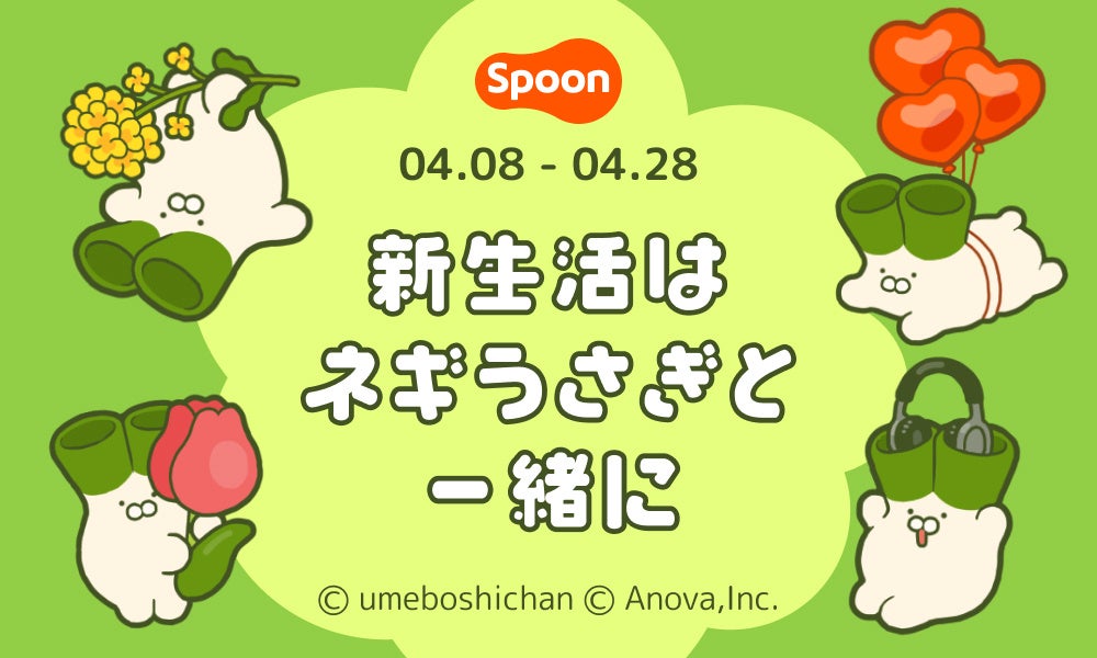 Spoonは、ユーザーがリアルタイムで音声を配信し、他の参加者とのコミュニケーションや対話を楽しむことができる顔が見えないオーディオソーシャルプラットフォームです。この度、新生活が始まるすべての人を応援するため、クリエイター「うめぼしちゃん」が手掛けるかわいい野菜やくだもののキャラクター「べじまる」シリーズの「ネギうさぎ」とコラボしたイベントを開催します。また、新生活にぴったりな豪華賞品をプレゼントするキャンペーンも実施します。