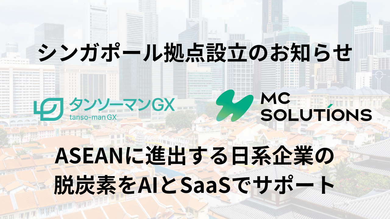 CO2見える化SaaS「タンソチェック」を運営し、脱炭素ロードマップ作成支援とGX関連のAI開発を行う株式会社タンソーマンGXとMC SOLUTIONS,INCは、シンガポールに新たなオフィスを設立したことを発表します。