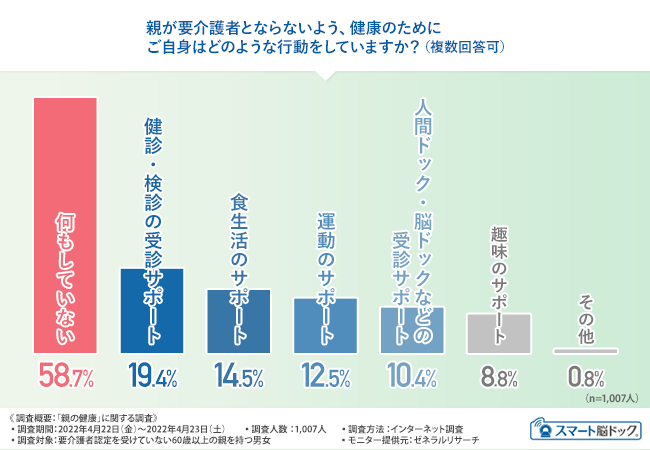 また、親御さんの健康のためのサポートについて、何もしていないという方が6割近くで最も多いことが判明しました。