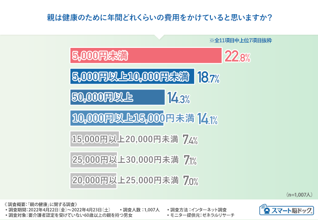 さらに、親御さんが健康のためにかけている費用は年間10,000円未満だと思っている方が4割にのぼる一方、50,000円以上かけていると思っている方も比較的多いことがわかりました。
