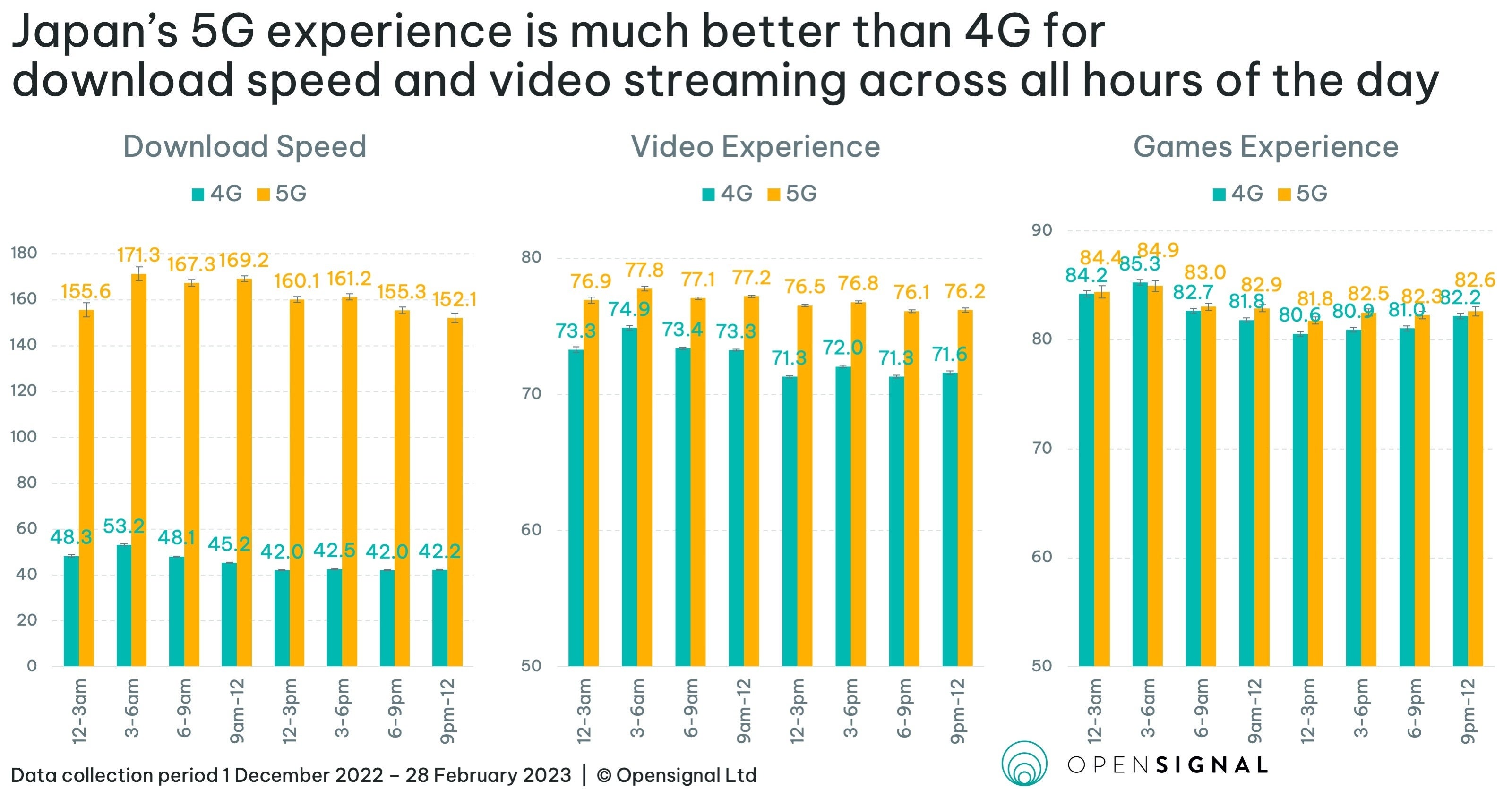 1日のすべての時間帯における5Gのエクスペリエンスも4Gよりはるかに優れています。5Gユーザーの平均ダウンロード・スピードは152.1Mbps~171.3Mbpsです。つまり日本における5Gのダウンロード・スピードは4Gの平均ダウンロード・スピードの3.2倍から3.8倍の速さです。