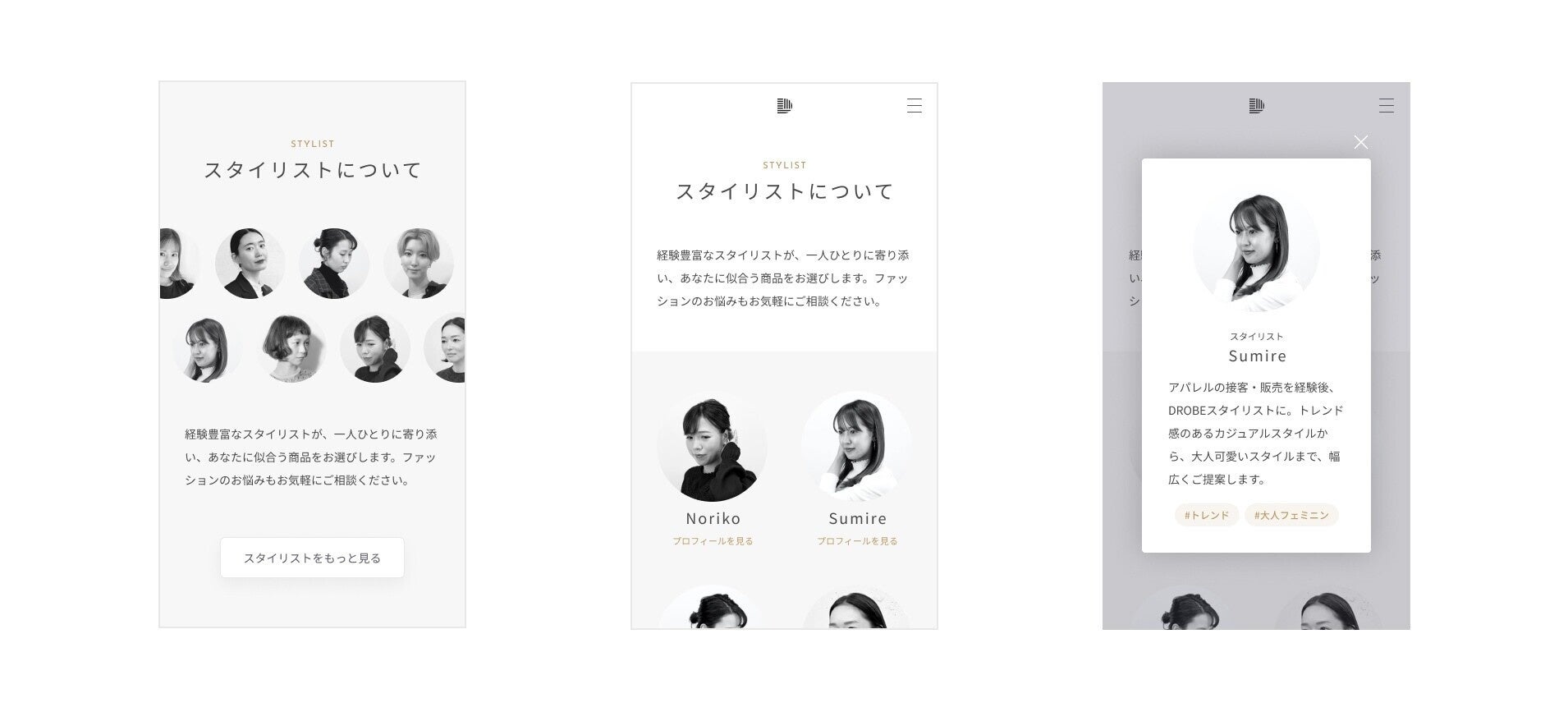 サービス説明部分には、ネットショップやレンタルサービスとの違いなどの内容を追加し、ご利用の仕方も「見やすく」「分かりやすく」なるように改善いたしました。画像もクオリティーにこだわり、具体的なお届けイメージや、スタイリストからの着こなしのアドバイスを記載した「カルテ」のビジュアルも掲載し、実際にご利用いただいたときのイメージがしやすいように変更しております。また、スタイリスト紹介のページを新設するなど、よりサービスに親しみを持っていただける内容に改新いたしました。
