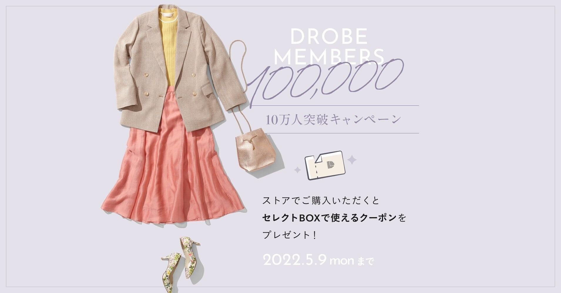 会員数10万人・サイトのリニューアルを記念し、DROBEでは4月5日(水)より「会員10万人突破記念キャンペーン」をスタート。ストアの購入金額に応じてセレクトBOXのオプションがお得に利用できるクーポンを配布しており、既存のお客さまとこれからDROBEの継続利用をお考えのお客さまに喜んでいただけるキャンペーンとなっております。