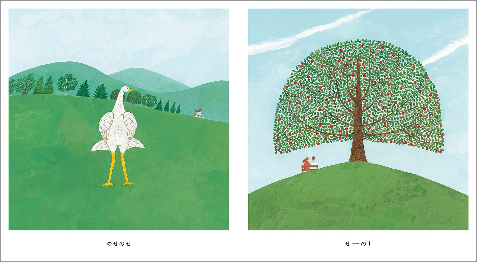 白い鳥がいます。そのとなりのページには、赤い実がたわわになった、大きな木。「のせのせ せーの!」とページをめくると...すてきな羽になりました!真っ白なワンピースがかわいい花柄になったり、ビーチボールが牛の模様になったり...ページにあるものが、次の場面の絵にどんどんのっかっていって…… 今度は何が「のせのせ」されるかな?