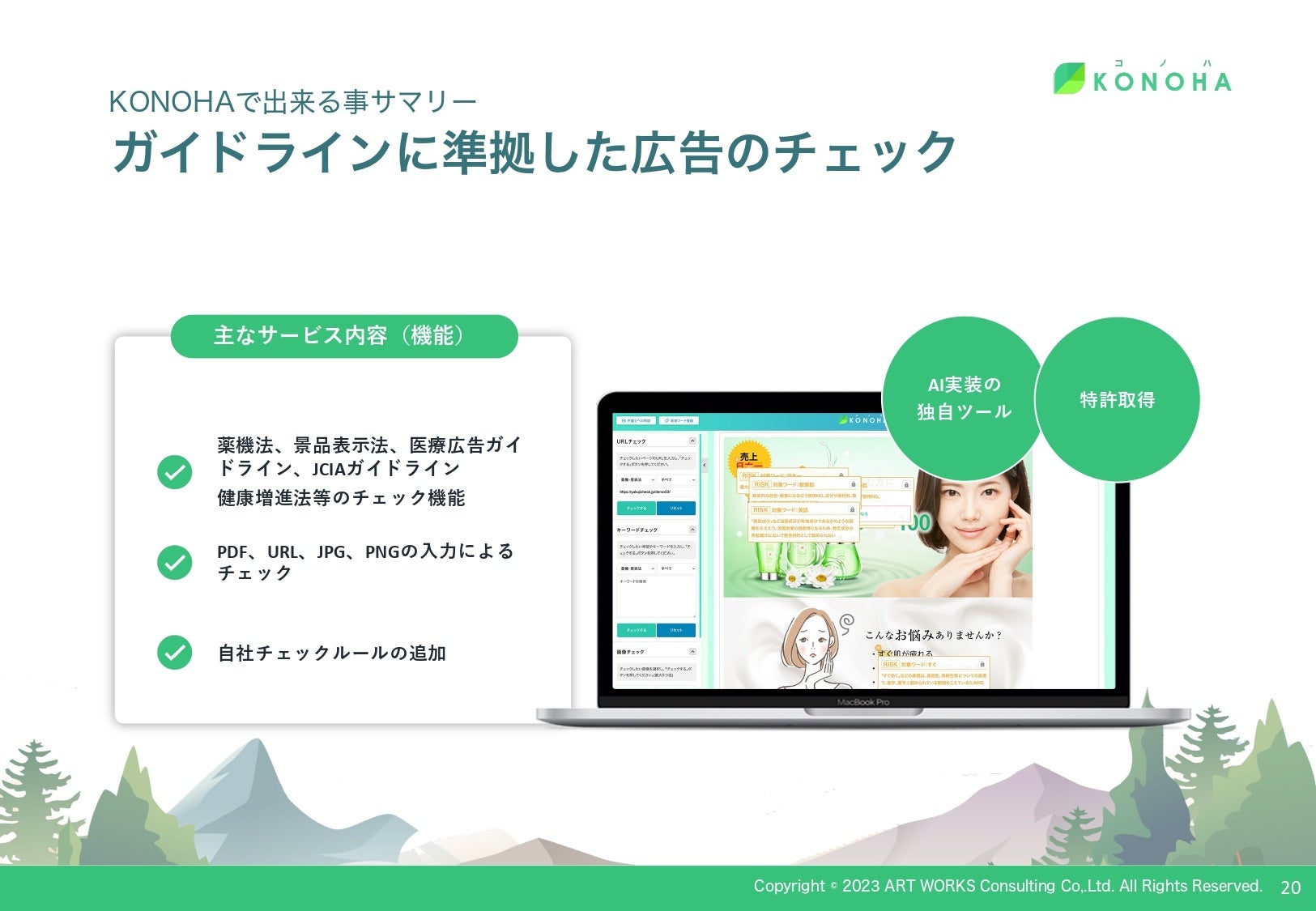 広告監修およびコンサルティング業務を手掛ける、株式会社アートワークスコンサルティング(所在地:東京都渋谷区東3-15-9 プライムハウスⅡ 2階、代表取締役:高橋聡)は、次世代AI広告チェックツール 『KONOHA AD』新機能実装を行いましたので、ここにお知らせいたします。