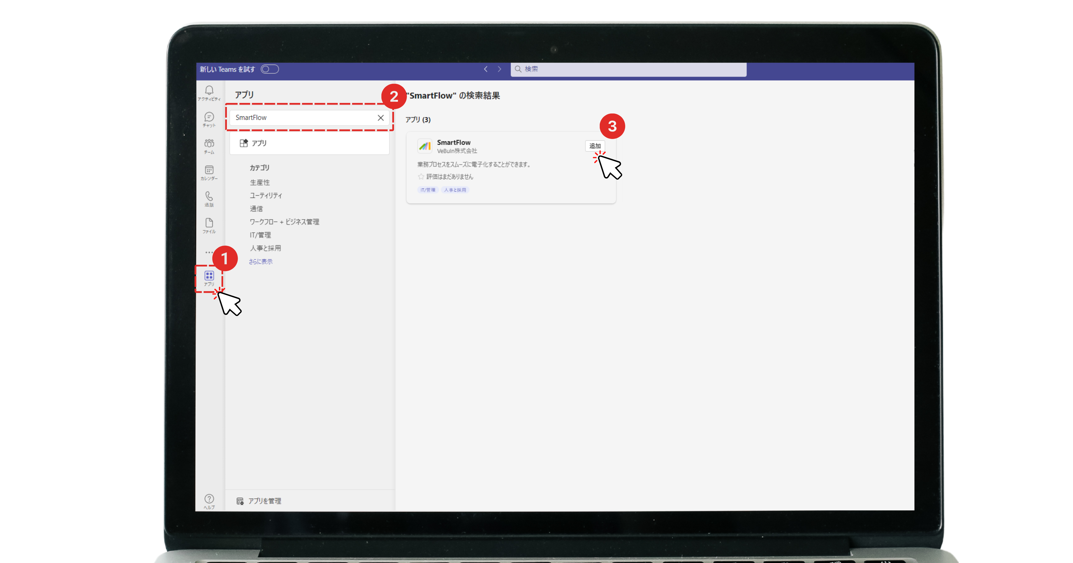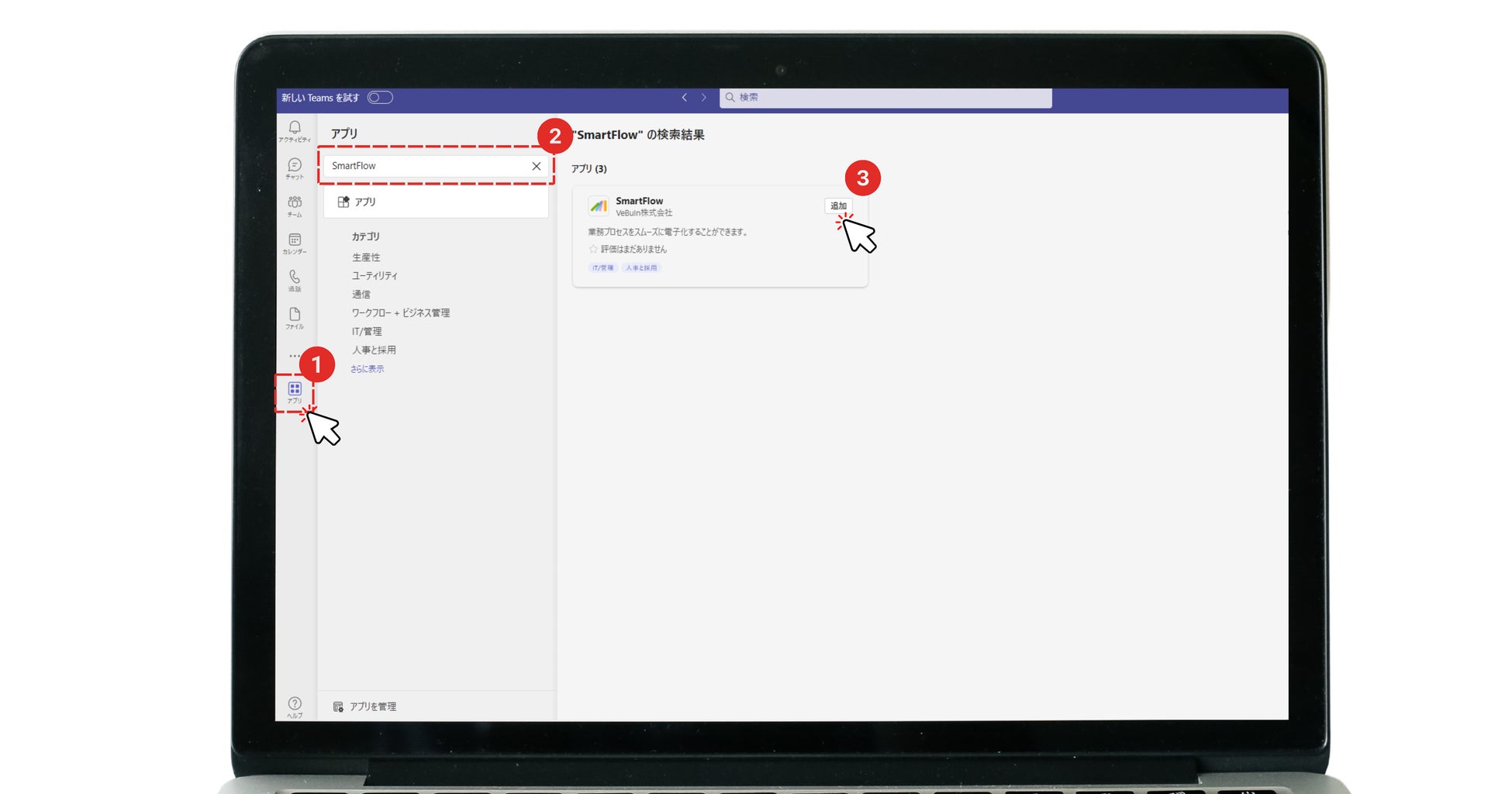 →Teamsアプリで、SmartFlowを検索し「追加」をクリックします。