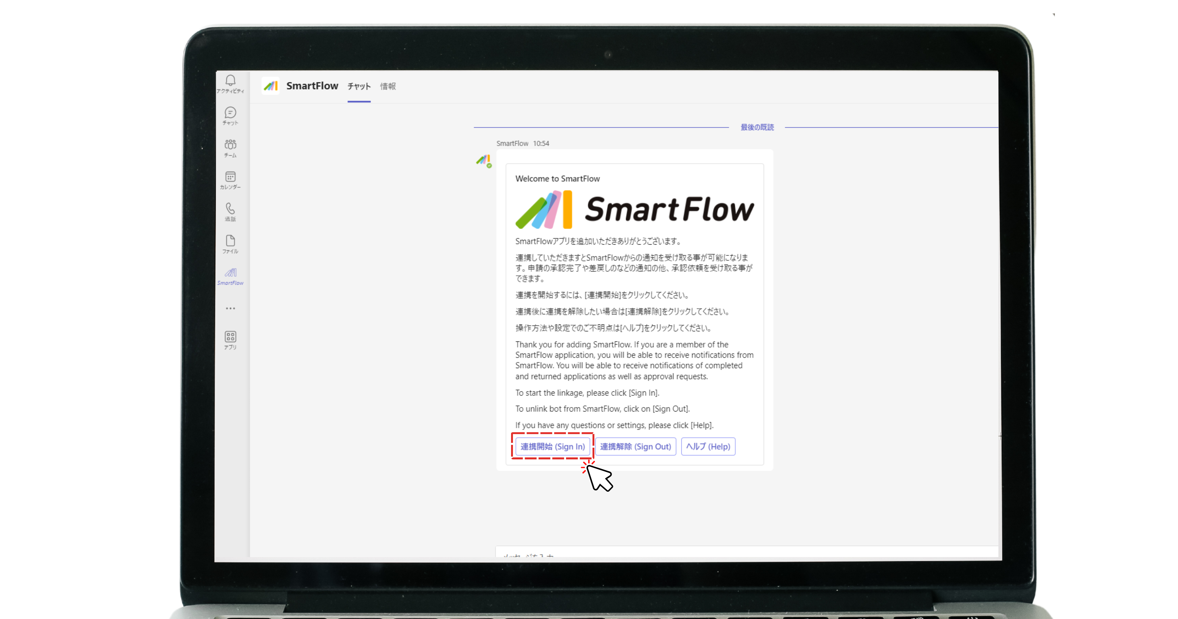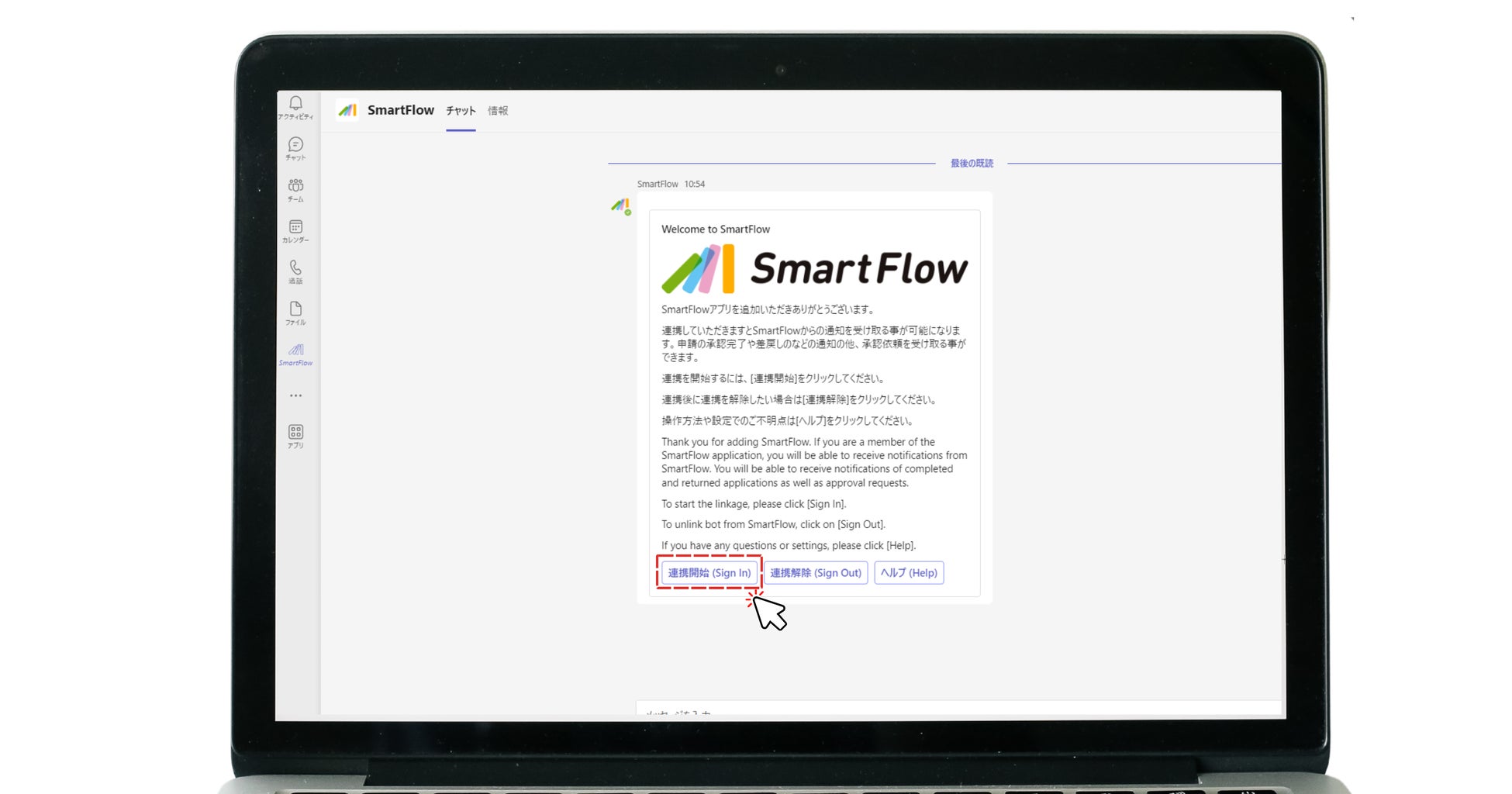 ②SmartFlowアプリをTeamsに追加し、初期認証(ログイン)を行うと、連携されます。