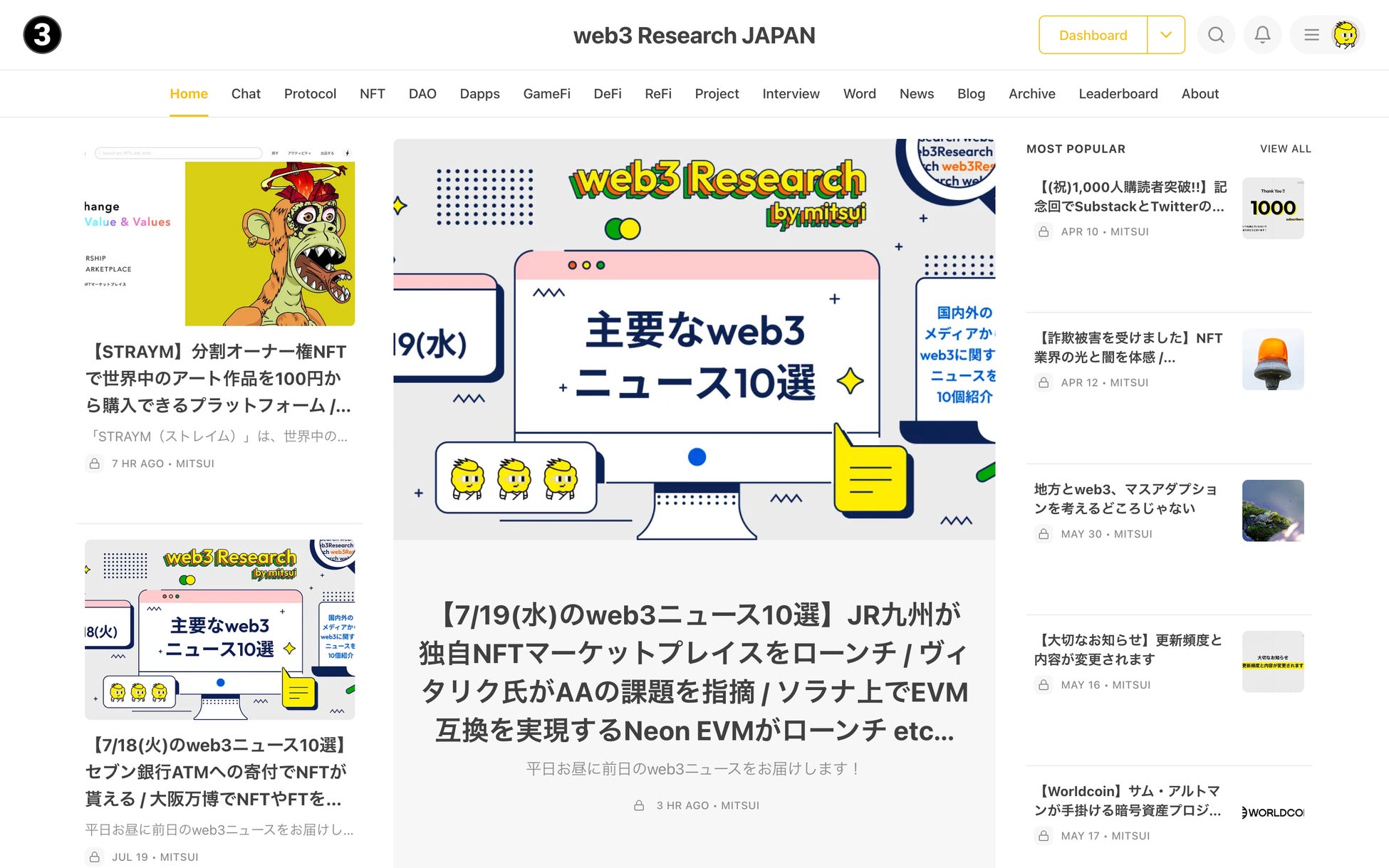 弊社ではこれまでweb3に関するリサーチ業務を行なってまいりました。弊社代表の三井はweb3リサーチャーとしてSNS上で活動し、運営するリサーチニュースレター(Substack)は購読者数1,500名を超える規模となりました。