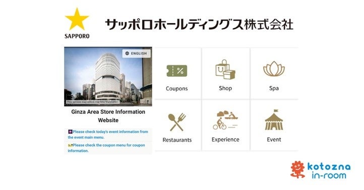 Kotoznaが提供するホテル向けの情報発信&コミュニケーションツール『Kotozna In-room』は、2024年9月13日よりサッポロホールディングスによる銀座エリアでの店舗情報サイト閲覧データ収集・分析によるインバウンド向けマーケティングの実証実験にて採用されました。