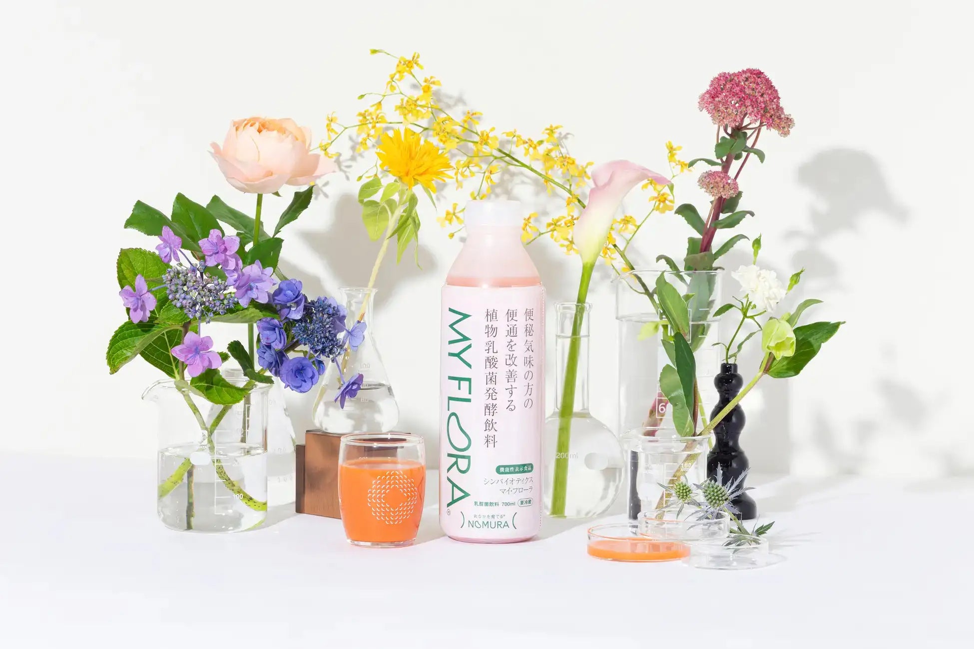 「シンバイオティクス マイ・フローラ」【機能性表示食品】は、「おなかを育てる」をコンセプトにしている野村乳業(1897年創業)が培ってきた独自の発酵技術を用い、広島大学との共同研究から生まれた新しい乳酸菌飲料です。一般的な乳酸菌飲料が牛乳を動物乳酸菌で発酵させているのに対し、「マイ・フローラ」は生命力の強い“植物乳酸菌”で野菜を発酵させています。にんじんの自然な甘さに乳酸菌が醸す酸味がマッチしたさわやかな味です。