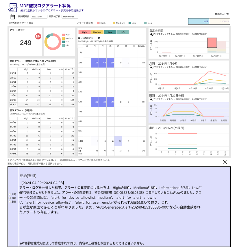 本ソリューションは、ユーザーのセキュリティ状況を可視化した専用のダッシュボードで、あらゆるデータ形式や構造に対応し、月間・週間・単日のアラートログの集計結果を可視化しAIで分析、要約処理を実施します。