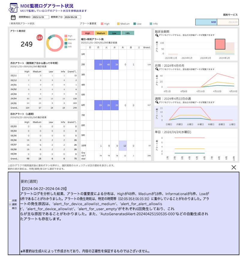 この機能によって、これまで大きな手間と専門家により時間をかけて作成していた分析結果および要約で構成されるレポートが、生成AIによってテキストにて表示され、さらにダッシュボード上で期間(月間・週間・単日)を選ぶと瞬時に要約結果が切り替わることで、セキュリティリスクの回避だけではなく、セキュリティに関わる人員コスト、リソースも大幅に削減できることに加え、よりプロアクティブなセキュリティ対策が可能となります。