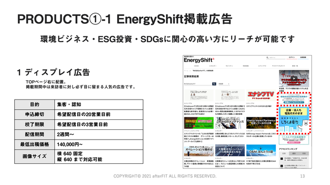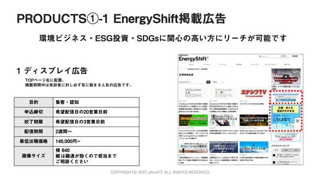 株式会社afterFIT(本社:東京港区芝大門、代表取締役 谷本貫造)が運営している、脱炭素メディア「Enargy Shift(エナジーシフト)」より、「EnergyShift掲載広告」の運用開始をご案内いたします。