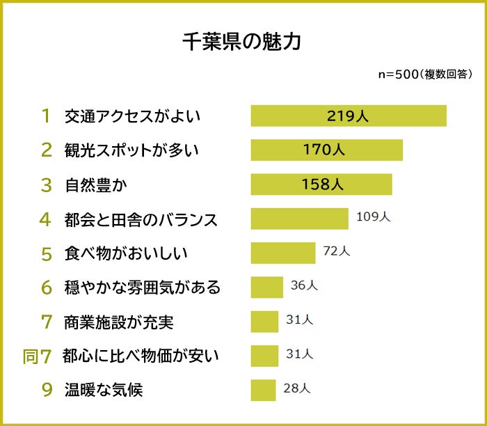 千葉の魅力としては「交通アクセスがいい」「自然が豊か」「観光施設が多い」など、さまざまなものが挙がっています。
