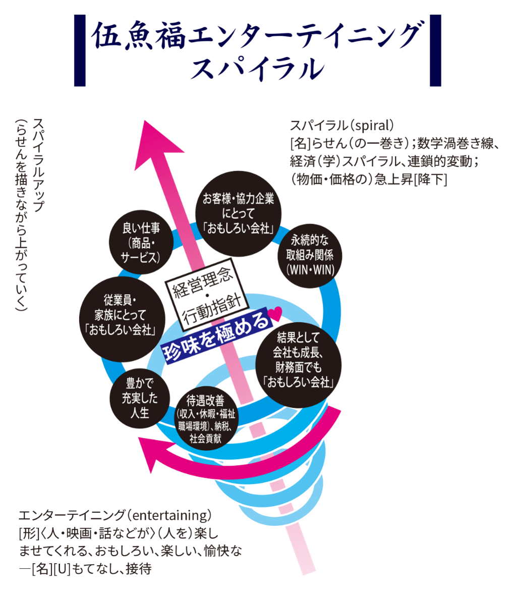 伍魚福様は商品を通じてお客様や社員、協力企業にとってエンターテイニングを提供することを目指されています。行動指針にもその旨があり、「神戸でいちばんおもしろい会社を目指す」と公言されており山中社長からの強いメッセージを感じます。