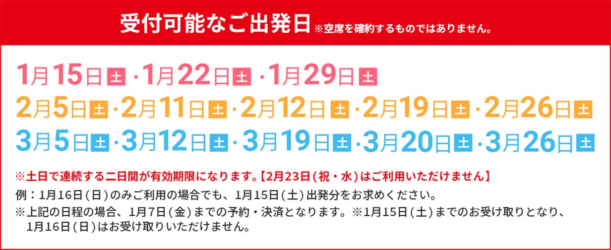 1月29日・2月5日・2月11日・2月12日・2月19日・2月26日・3月5日・3月12日・3月19日・3月20日・3月26日出発限定1泊2日コース