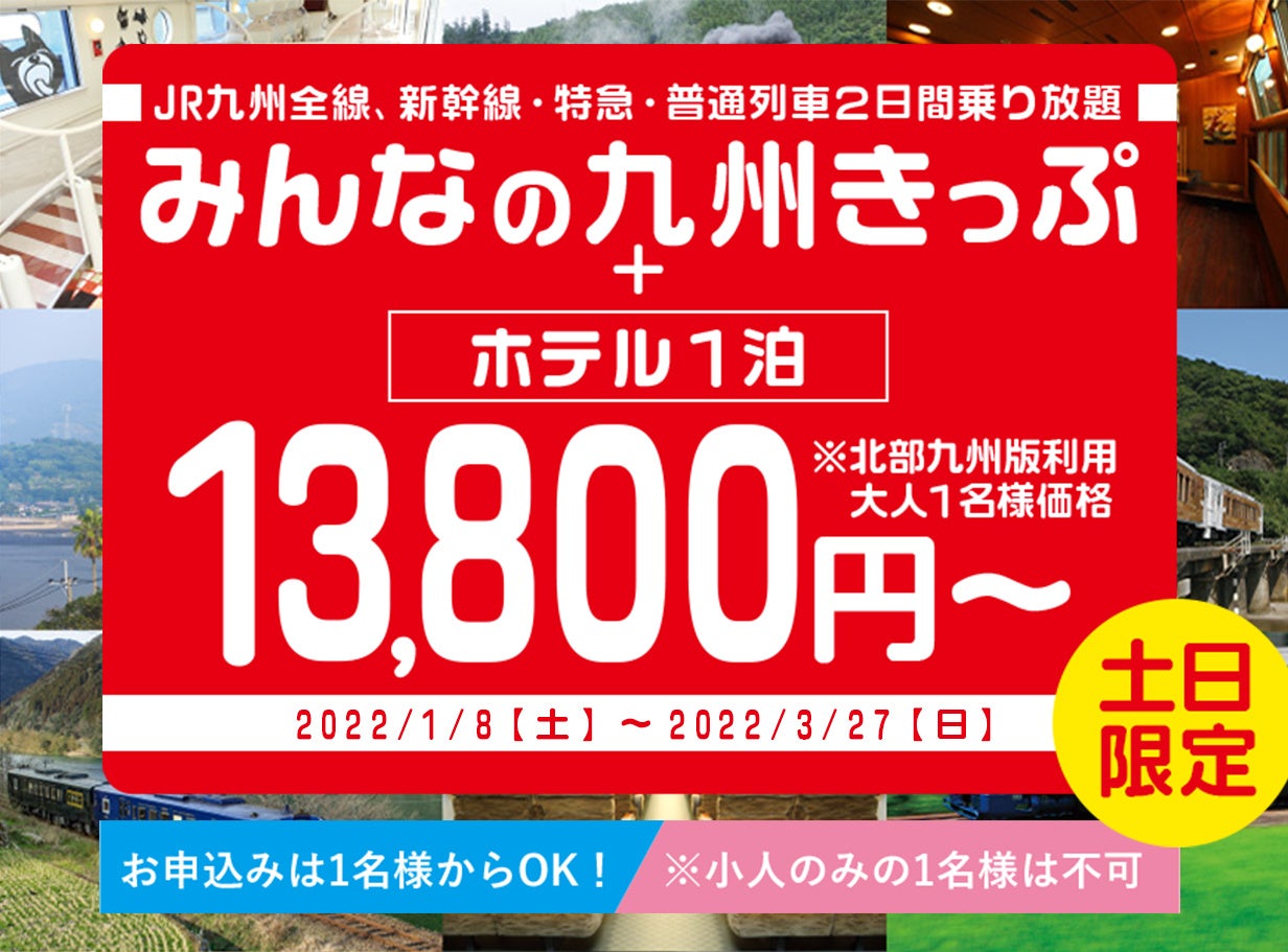 【1泊2日13,800円~】JR九州の九州新幹線、特急列車、普通列車乗り放題+ホテル1泊付!みんなの九州きっぷ+ホテル付《1月・2月・3月の12日間出発限定》