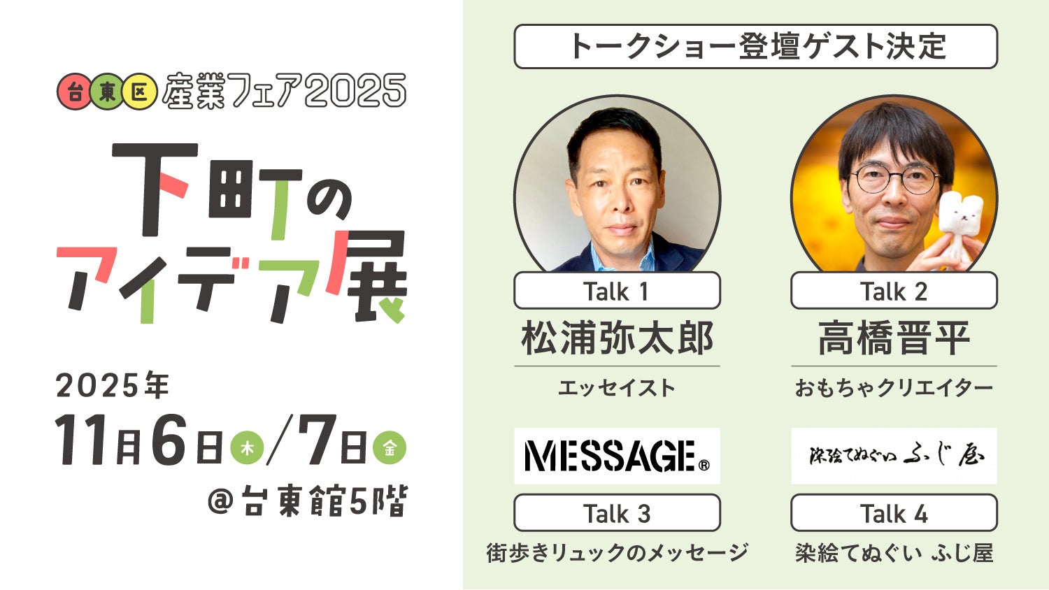 「台東区産業フェア2025」のトークショータイムテーブルを公開しました。イベントはビジネス⽬的の⽅、消費者の⽅どなたでもご⼊場いただけます。⼊場無料のイベントですのでぜひお気軽にお越しください。