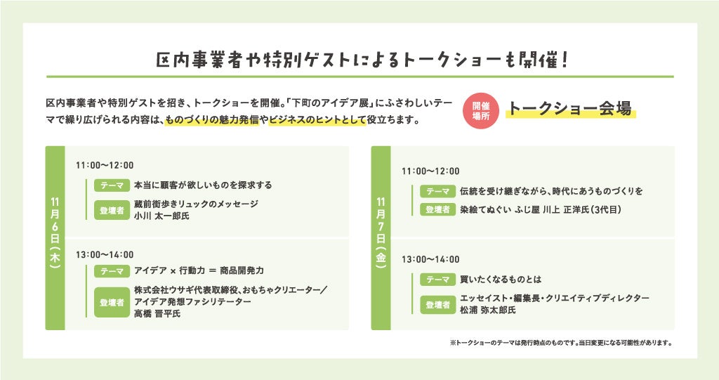 本年度のトークショーは2⽇間で4テーマ開催。 台東区企業の伝統技術やものづくりの魅⼒、ビジネスのヒントを発信します。