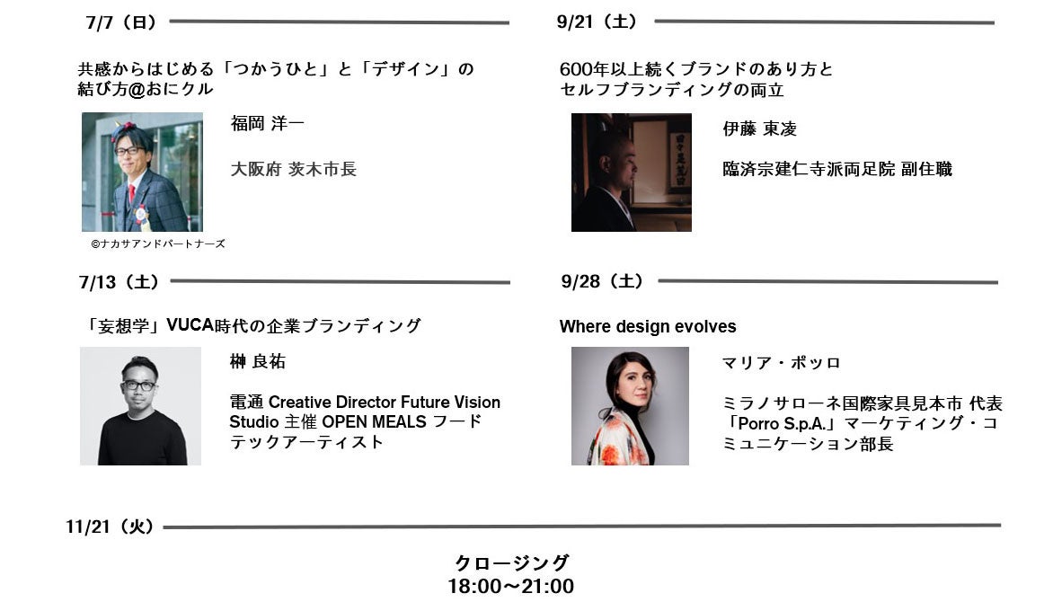 原 亮介(株式会社ロフトワーク/MVMNTユニットリーダー)、野崎 亙(株式会社スマイルズ/取締役社長 兼 CCO)、福岡 洋一(大阪府 茨木市長)、榊 良祐(電通 Creative Director ・Future Vision Studio 主催・ OPEN MEALS フードテックアーティスト)、マリア・ポッロ(ミラノサローネ国際家具見本市 代表・「Porro S.p.A.」マーケティング・コミュニケーション部長)、伊藤 東凌(臨済宗建仁寺派両足院/副住職)、細尾 真孝(株式会社細尾/代表取締役社長)、斯波 雅子(BEAF & ONBD/Co-founder)
