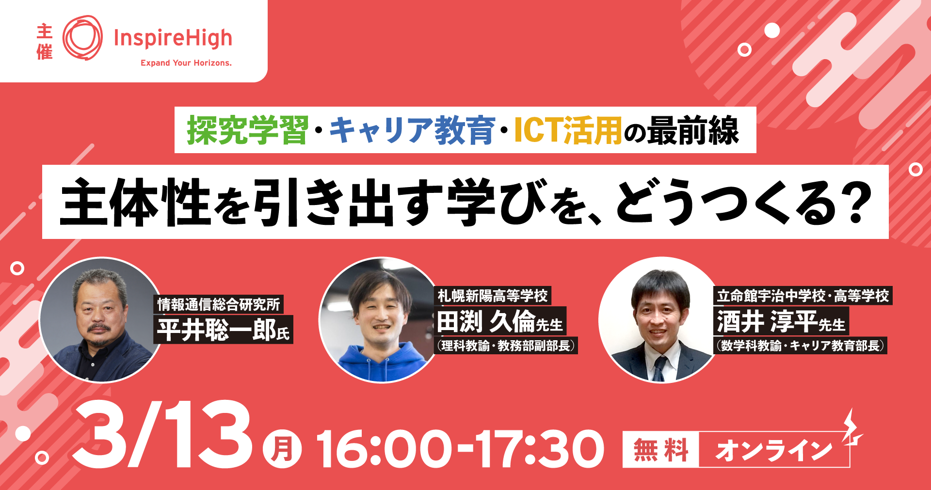 Inspire Highのアドバイザーでもあり、GIGAスクール構想前から教育のICT化を牽引し、児童生徒の本質的な学びのあり方を追求してきた平井聡一郎先生、各校で「生徒一人ひとりの主体的な学びの機会」をつくっている札幌新陽高校の田渕久倫先生、立命館宇治中学校・高等学校でキャリア教育や探究教育をリードする酒井淳平先生と共に、これからの探究活動・キャリア教育・ICT活用を考えていきます。