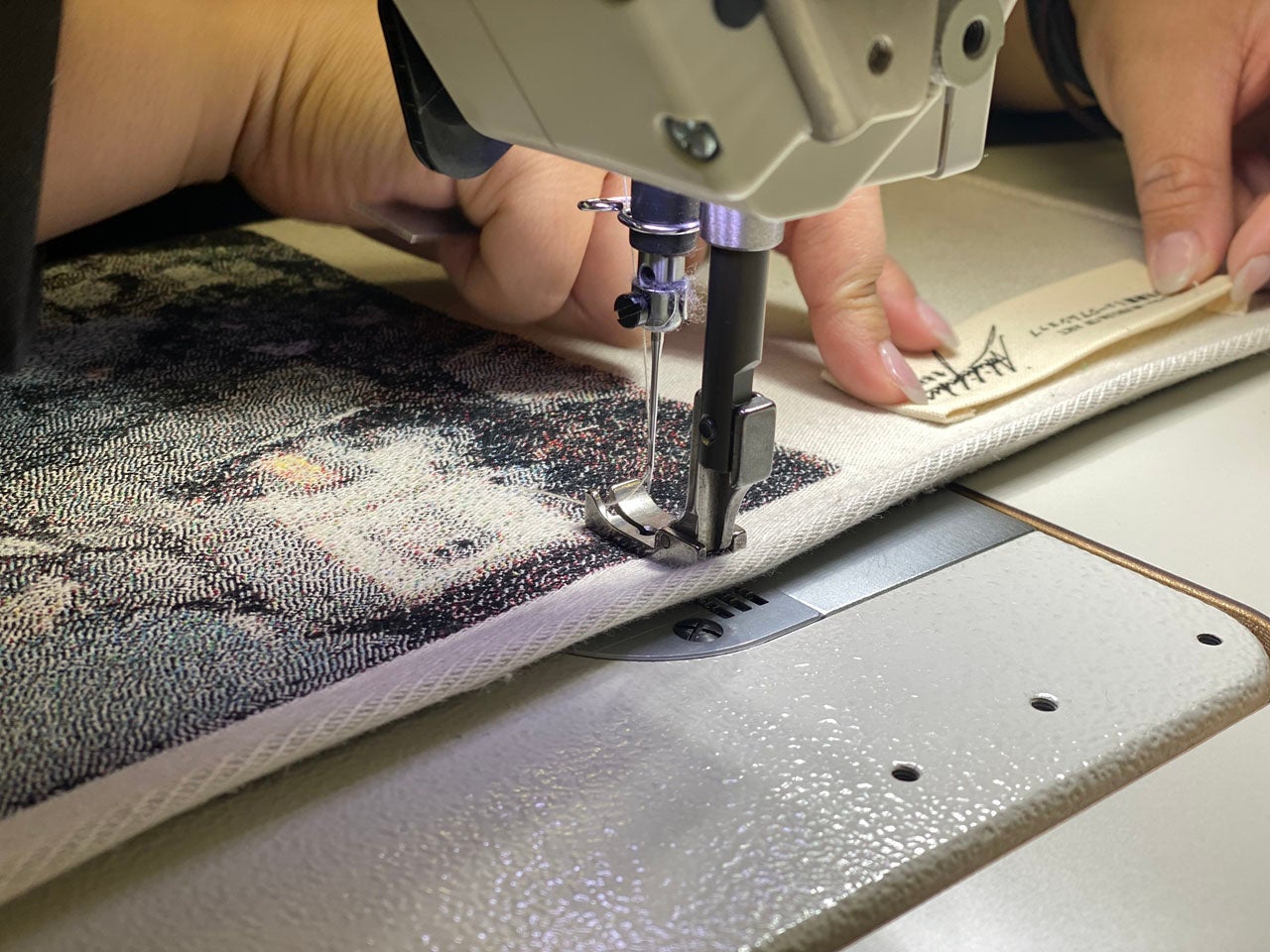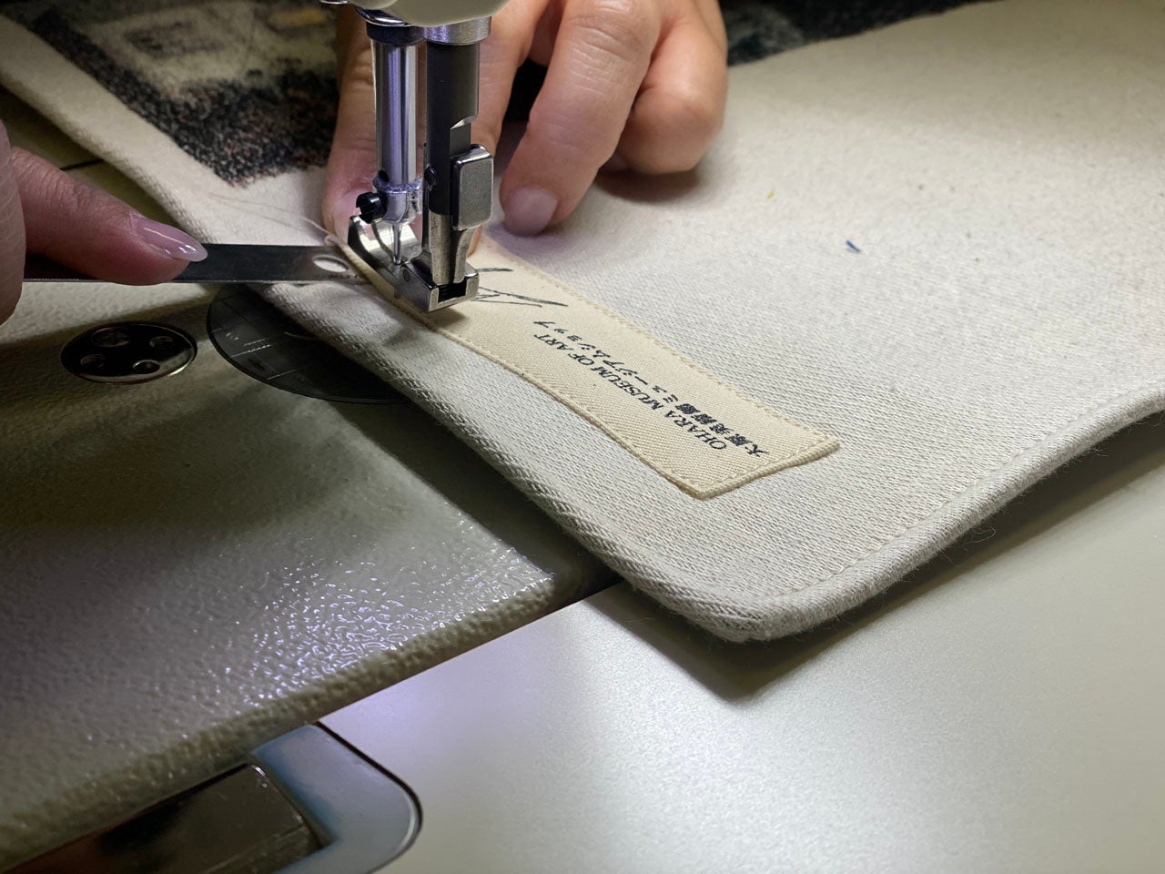 「大原美術館ミュージアムショップ × 青木被服」のコラボレーションネームを取り付け完成されていきます。