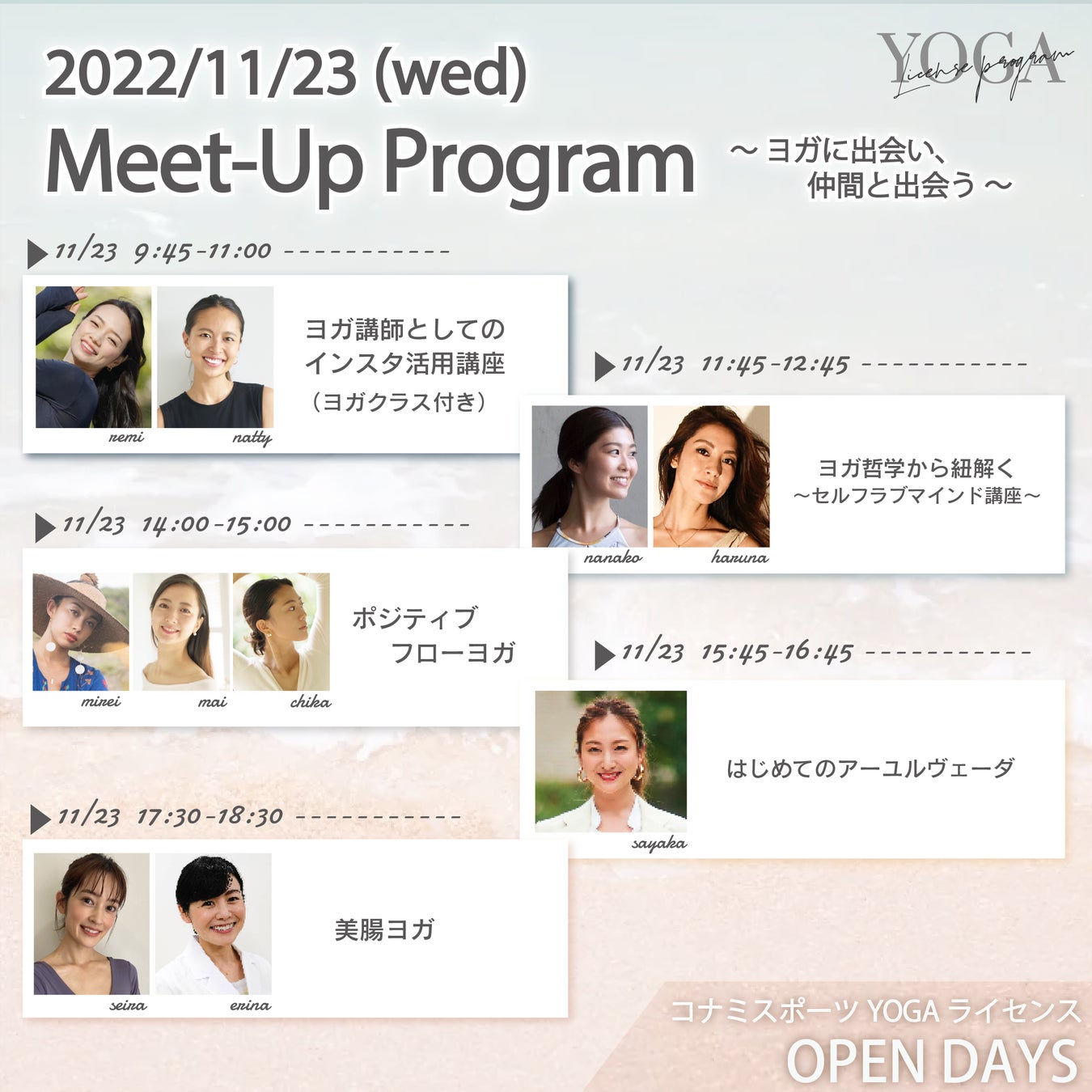 コナミスポーツ株式会社(以下、「弊社」)は、2022年11月23日(水・祝)に人気講師から直接レッスンを受けられるヨガイベント「コナミスポーツYOGAライセンス OPEN DAYS」の第2弾となる「Meet-Up Program」を開催いたします。