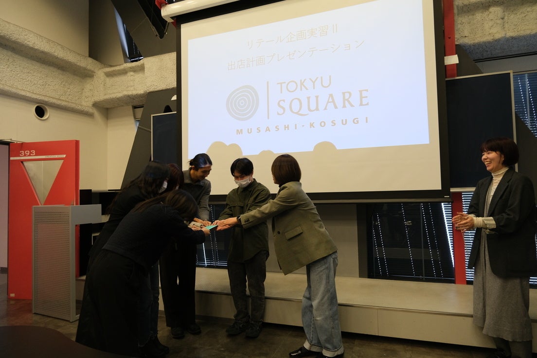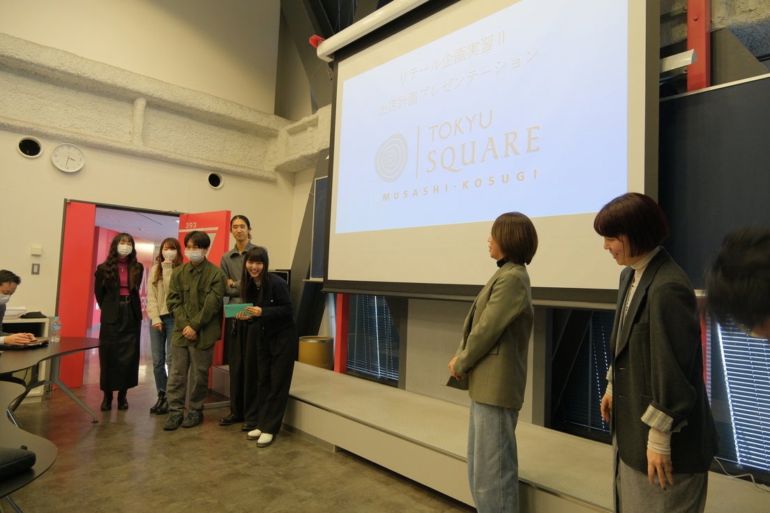 約6か月の期間の中で、学生たちは武蔵小杉東急スクエアに関して、数値的分析やマーケットリサーチから開始し、現地視察を通じて提案テナントの必要性や将来的な発展について検討していきます。施設に足りないMDや、これから必要となる業態は何なのか、机上の空論ではなく、客数や客単価というリアルな視点も重視しながら学生たちはプランをそれぞれ立案しました。そして、東急モールズデベロップメント 武蔵小杉東急スクエアの支配人とMD担当者をゲストに迎え、緊張感漂う雰囲気のなか、学生たちが直接プレゼンテーションを行いました。東急モールズデベロップメントは真剣に学生たちの提案に耳を傾け、それぞれのプランに対してフィードバックを提供しました。