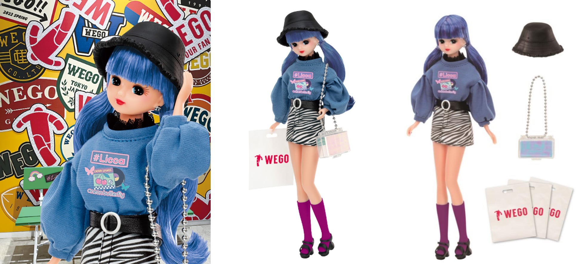 「#Licca #WEGO」は、ティーンを中心に絶大な人気を誇るアパレルショップ「WEGO」がデザインプロデュースしたドールセットです。近年ブームになっている“青系”のヘアカラーと、オーバーサイズのトップスやタイトなボトムス、厚底サンダル、バケットハット、オーロラカラーのバッグなど、ティーンのトレンドファッションを取り入れています。