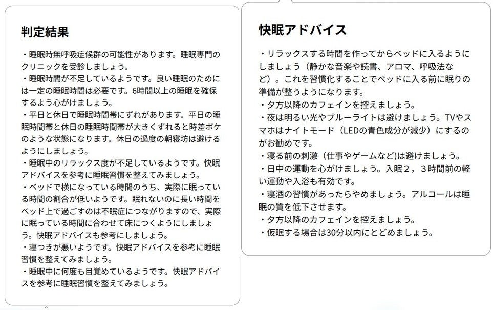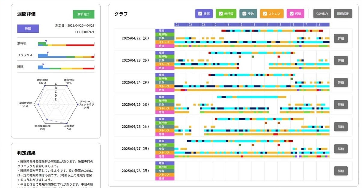 これらの解析結果のサマリは結果表示画面上にカラーチャート、レーダーチャート等で分かりやすく表示するとともに、同結果に基づいた分析結果や快眠に向けたアドバイスを提示します(図2-図4に例示)。なお、分析およびアドバイスは北里大学大学院医療系研究科産業精神保健学 田中克俊 教授の監修の下、作成しました。また、これらの結果は、非スマホユーザには紙媒体で、スマホ利用者にはWEBで提供するとともに、本人許諾の下、産業医等の専門家は閲覧の他、各詳細データのファイルダウンロードや印刷ができます。