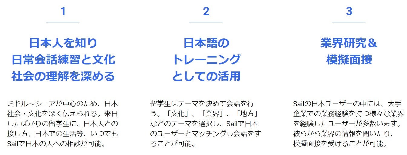 日本語でのグローバル・コミュニケーション・サービス「Sail」は、これまで国内外の大学や日本語学校に導入されてきた実績を持ち、日本で就職を希望する日本語学習者などの来日後の会話力向上のため活用されてきました。