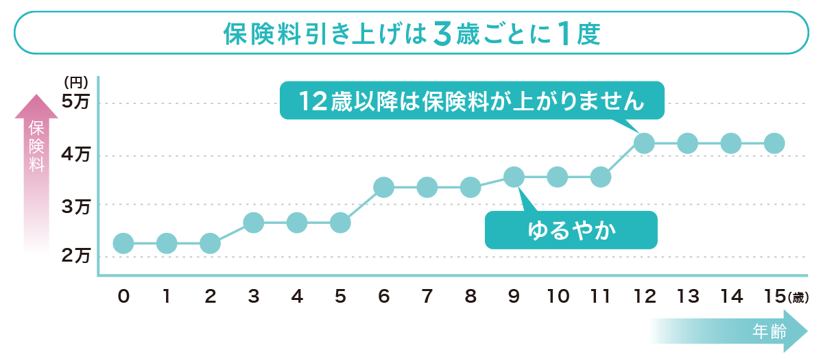 (注)ペットセレモニー特約(火葬費用担保特約)をセットしている場合、12歳以降も年齢(3歳ごと)とともに18歳まで、保険料が上がります。