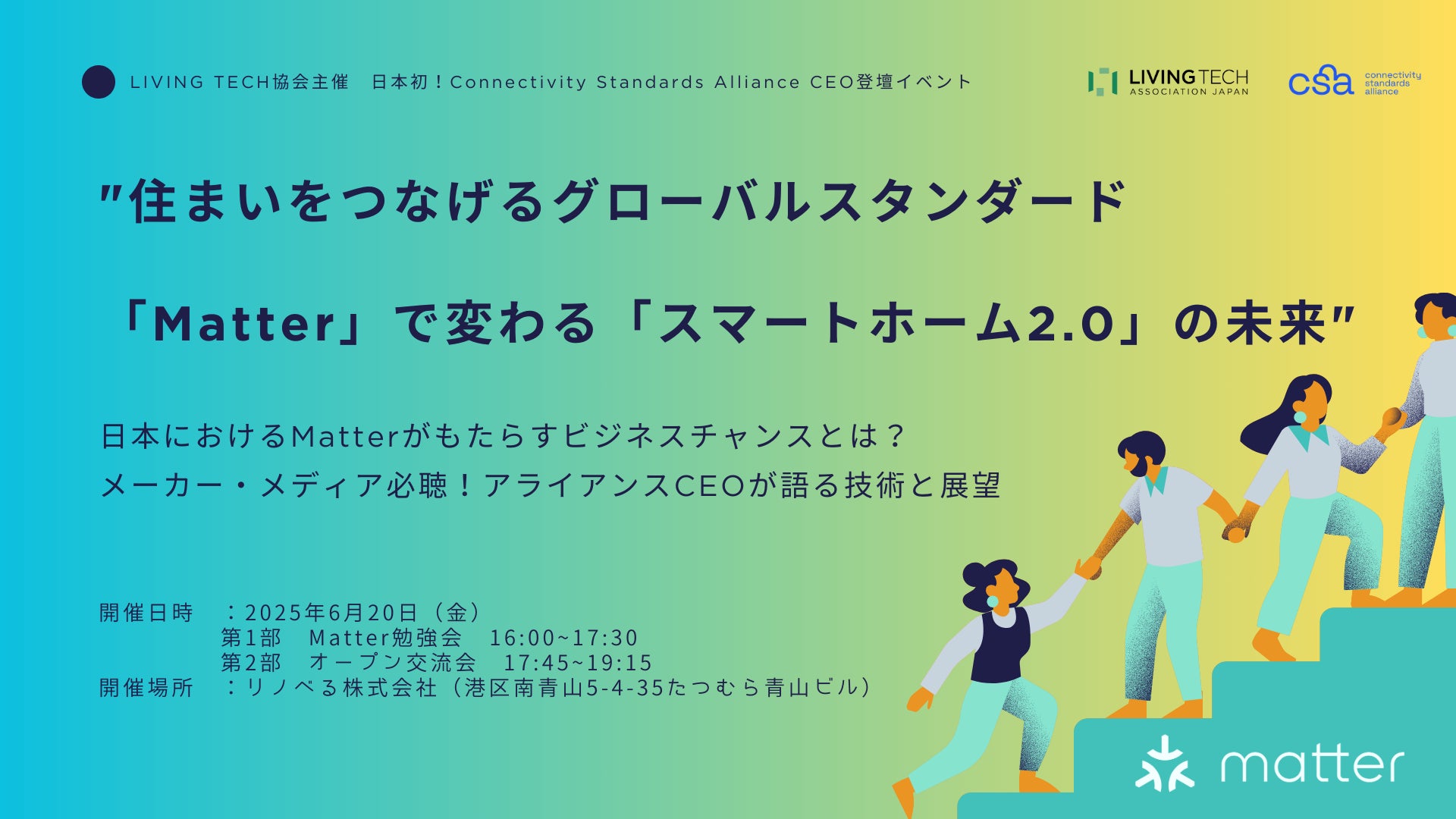 一般社団法人LIVING TECH協会(東京都港区、代表理事:山下智弘・澤田大輔)が、2025年6月20日(金)に、スマートホームのグローバル共通規格「Matter」の認証団体Connectivity Standards Alliance(以下、アライアンス)のPresident and CEOであるTobin Richardson氏の来日に合わせ、「Matter」の普及に向けた日本初のアライアンス公認イベントを開催いたします。