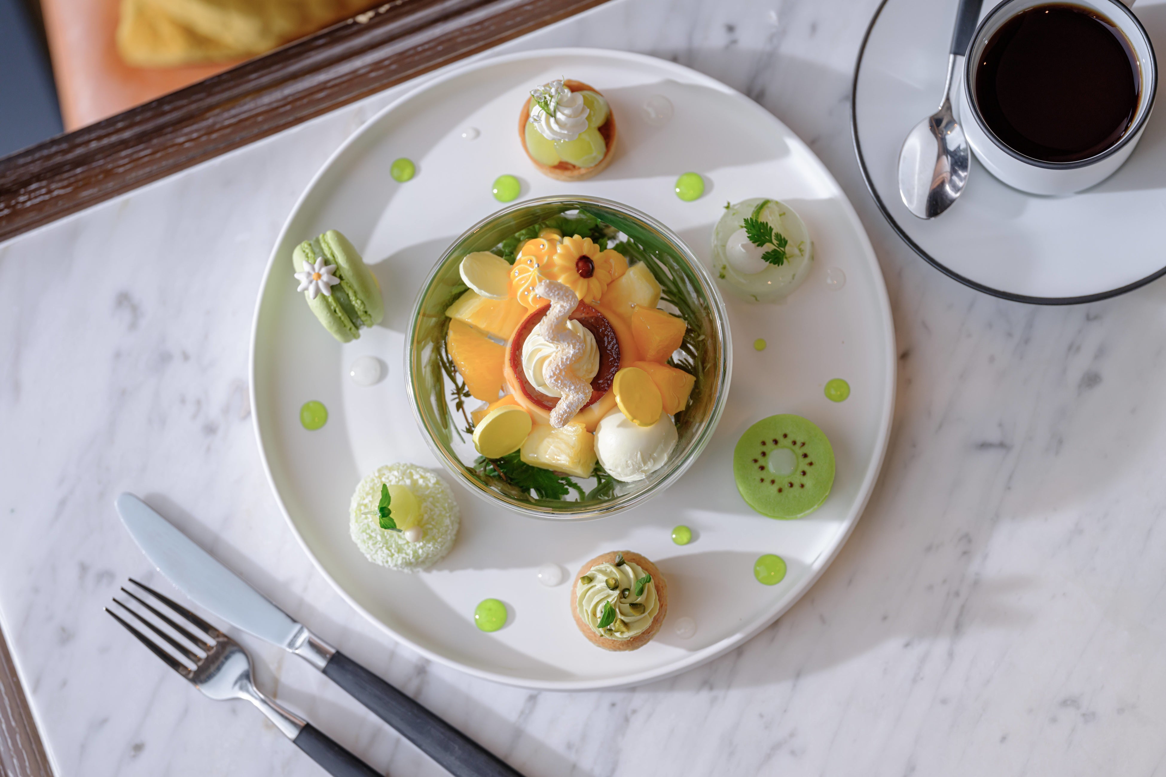 マンゴーやシャインマスカットなど、季節のフルーツをふんだんに使用したスイーツや、濃厚な味わいのプリン・ア・ラ・モードが一皿で楽しめる夏のケーキセットをご用意しました。気分をあげてくれるトレンドのビタミンカラーでまとめ、見た目も味も楽しめる一品に仕上げています。
