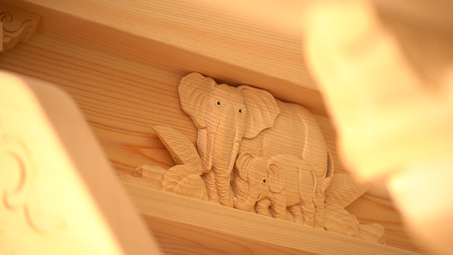 社殿の蟇股(かえるまた)に本来は鶴が施されることが多いのですが、タイの文化にも重要な役割をもつ「象」があしらわれており、シラチャ小國神社でしか見ることのできない特別仕様となっています。