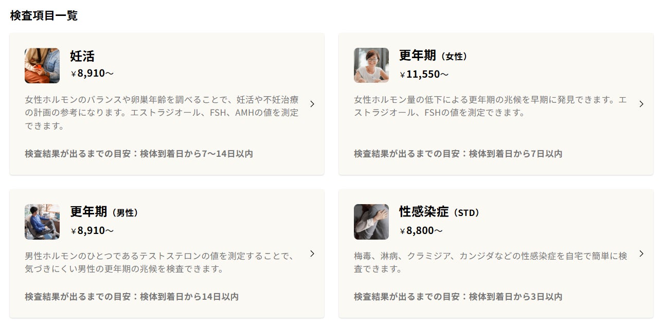 「ミナカラ オンライン検査」は、妊活や性感染症、更年期などプライベート性が高く、対面での診療には抵抗があるという方が多いカテゴリーを中心にラインナップしております。妊活用の検査キットに加え、性感染症検査キットの他、更年期検査キットもご用意しました。