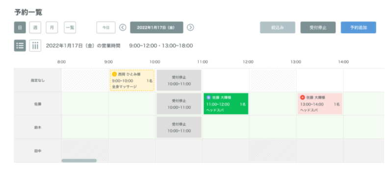 日ごと、週ごと、月ごとに、「誰が」「いつ」「何を」「誰を」予約しているのかが一目で分かります。