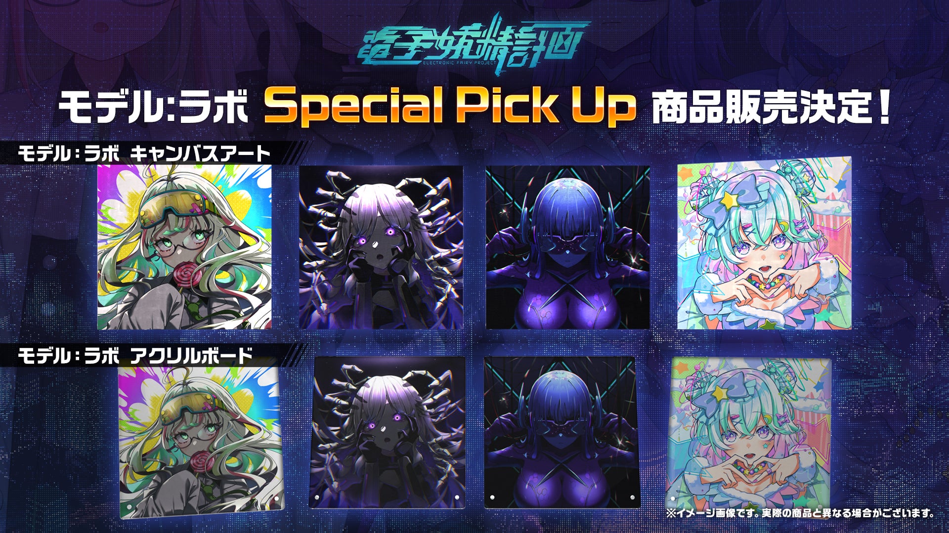 プレオープン時には「電子妖精計画」に関しては「Classic商品」として旧グラフィックスの商品を掲載しておりましたが、この度新商品としてこれまでのテイストにはない斬新なデザインで電子妖精を描いたSPU(Special Pick Up)商品を販売開始。第1弾としてモデルラボのメンバー4名を描いたSPU商品各種を販売。