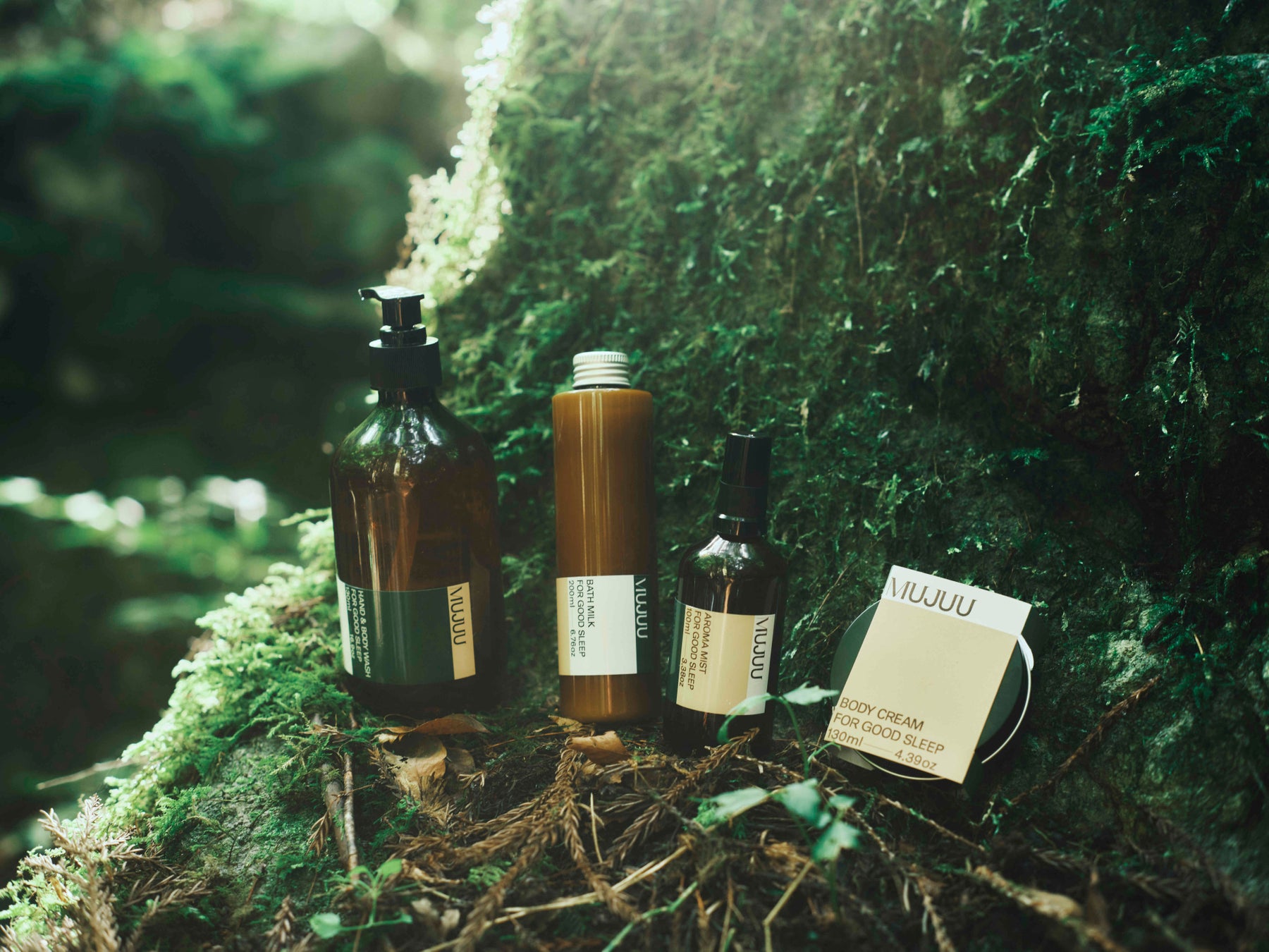 「MUJUU」は、五感の中で最もダイレクトに脳へと影響すると言われる“香り”に着目し、まるで森で眠るようなイメージで作られたオリジナルの香りを調合。ハンド&ボディソープ、バスアロマ、ボディクリーム、アロマミストの4商品を展開することで、一日のおわりに今日も頑張った自分を、香りで労るという“夜のルーティン”を実現しました。