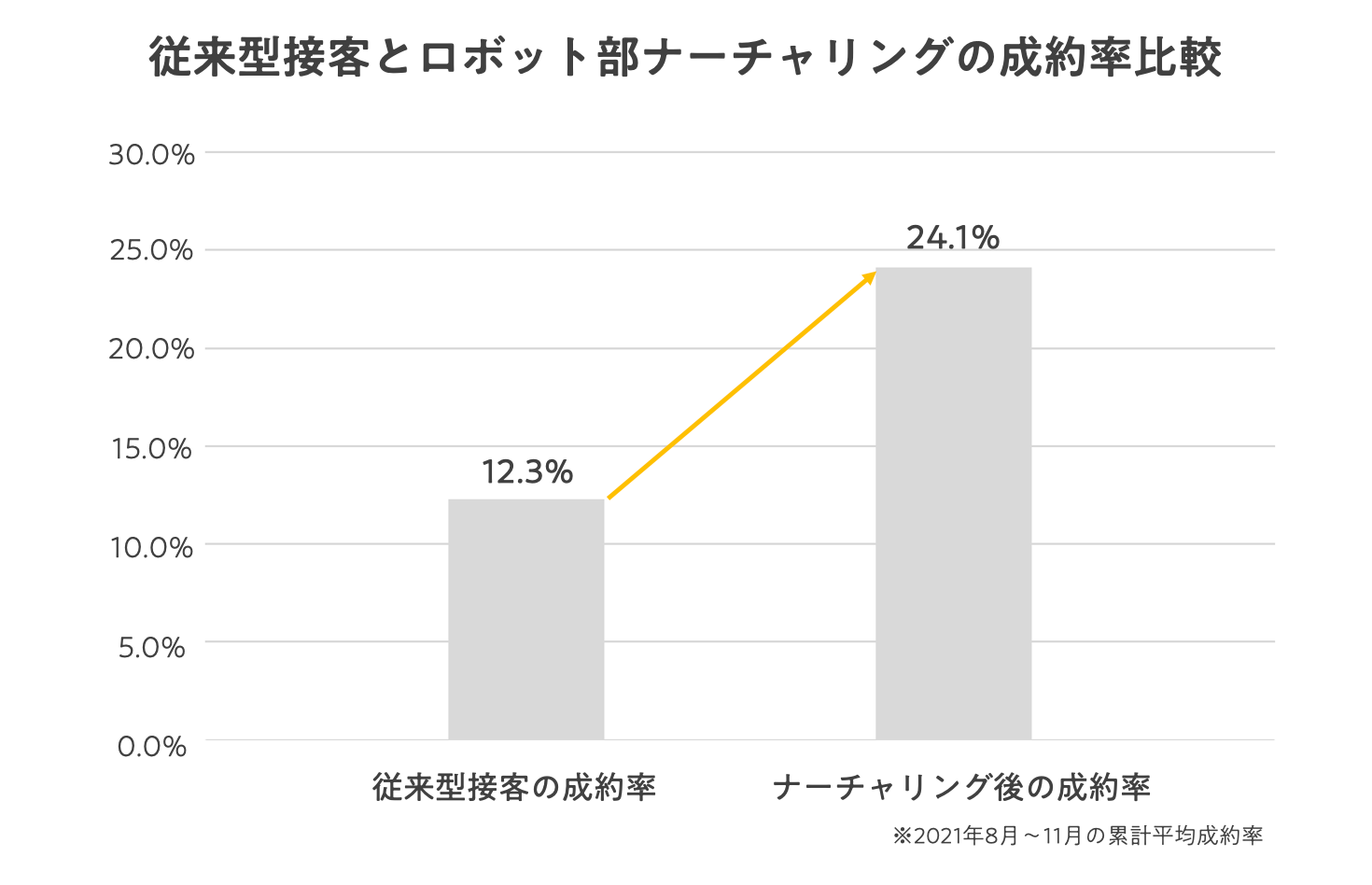 メリットは効率化だけではありません。少数精鋭のロボット部の担当者がリモートで全てのIKI展示場のお客様にご説明やご案内を行ってお客様の購買意欲を高め(ナーチャリング)、その後の店舗担当者と役割を分業することで、店舗担当者は新規受注活動と契約後の業務に集中することができます。この体制が進展し初めた2021年8月〜11月の4ヶ月間において、ロボット部によるナーチャリング後のお客様の成約率が、同期間中の、初回来場時に営業担当者が展示場で対面で接客を行う従来型の接客の成約率との比較で約2倍となっていることからも、リモート接客によるナーチャリングの効果の高さを裏付けています。