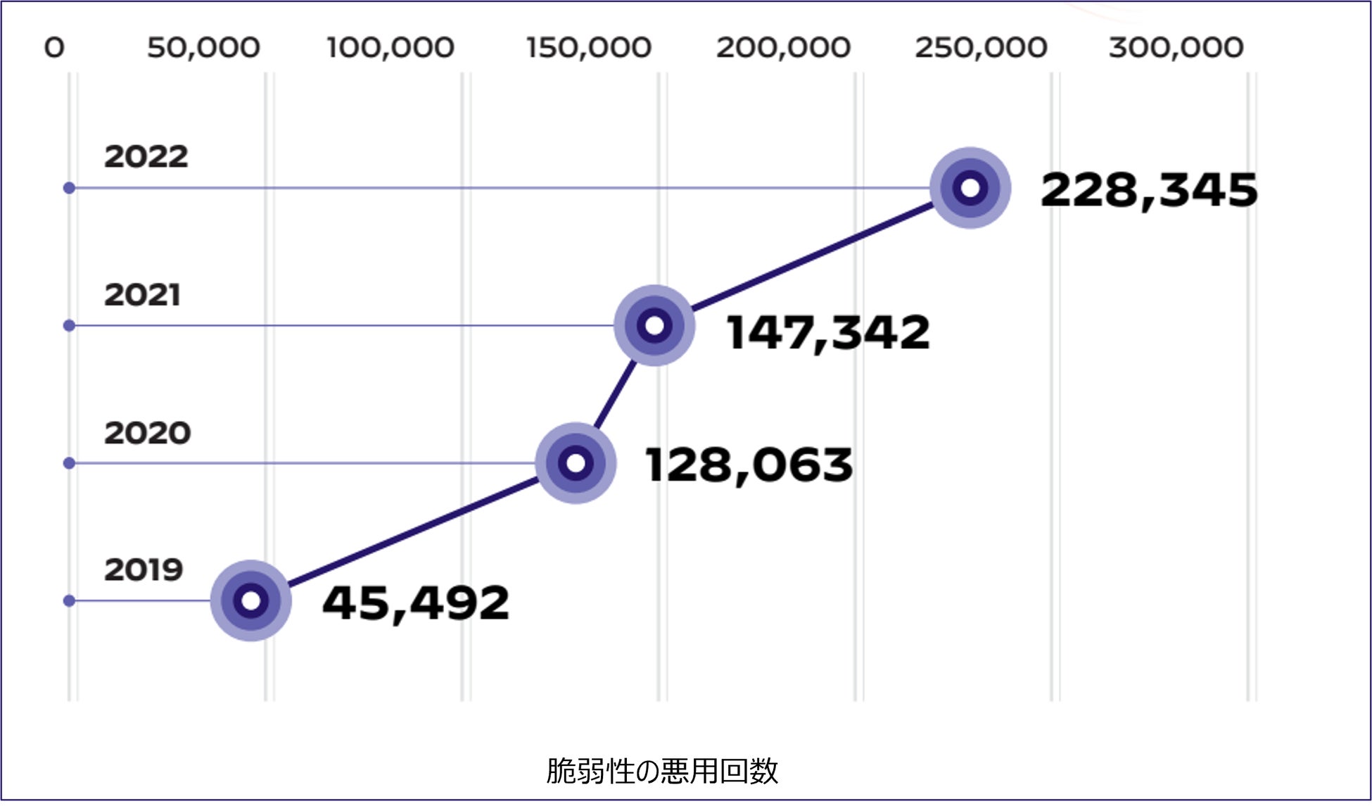 脆弱性の悪用は依然衰える気配がなく、前回調査で明らかになった2021年の約14万回から2022年は約22万回の55%に増加しました(2021年:147,342回 vs 2022年:228,345回)。