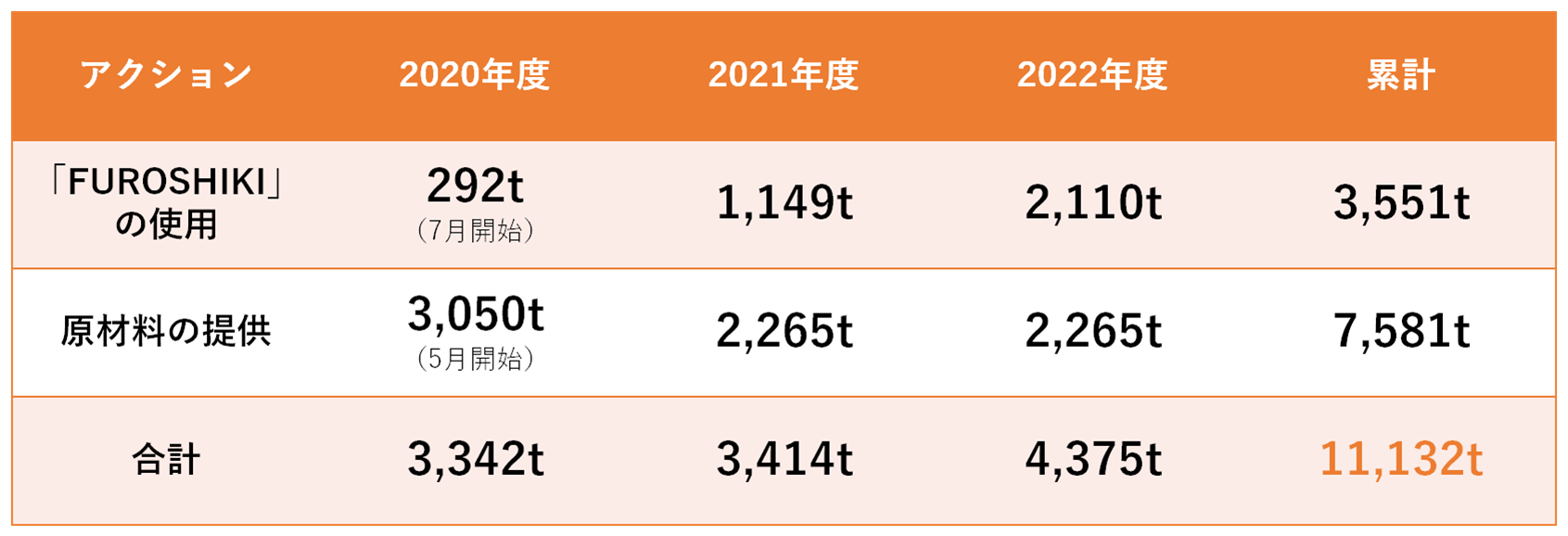 2022年4月1日~2023年3月31日に、約11,000の事業所が参画して『FUROSHIKI』の使用と原材料の提供に取り組み、合計4,375tのCO2排出を削減しました。これは、本プロジェクトで目指す年間5,000t削減に対して、87.5%の達成率です。目標には一歩及びませんでしたが、2020年のプロジェクト始動以来、年間で最高値を記録しました。