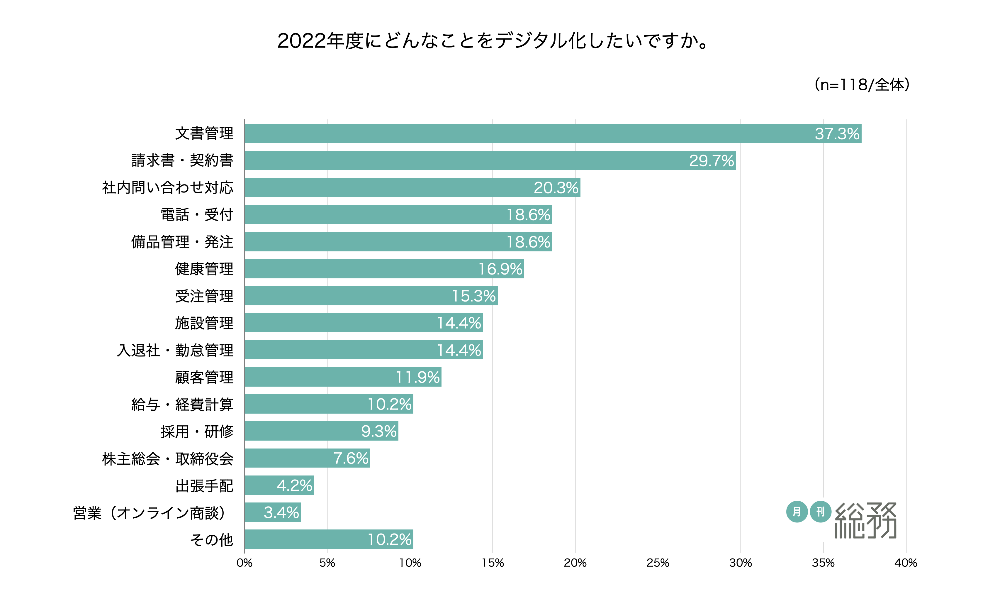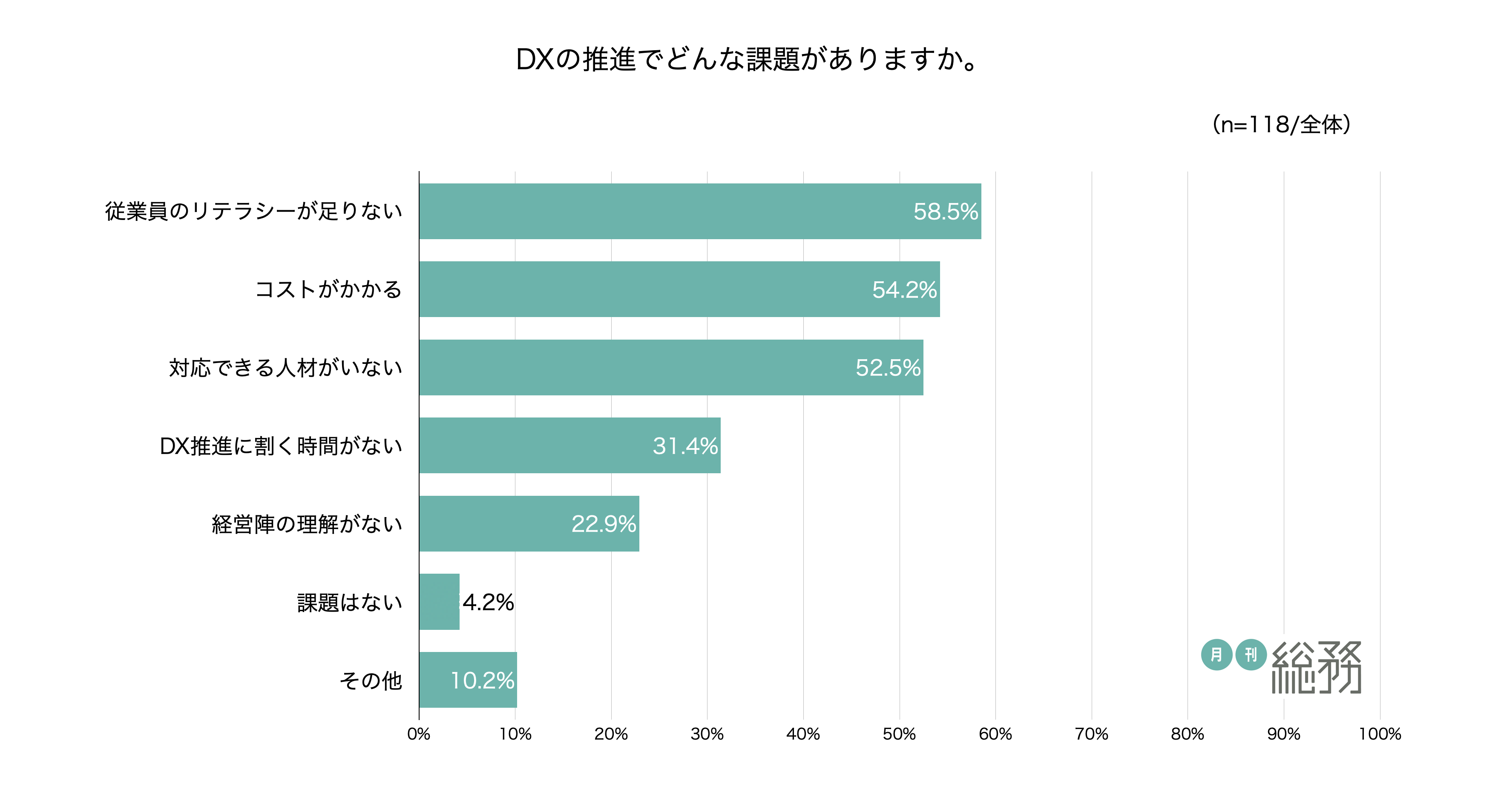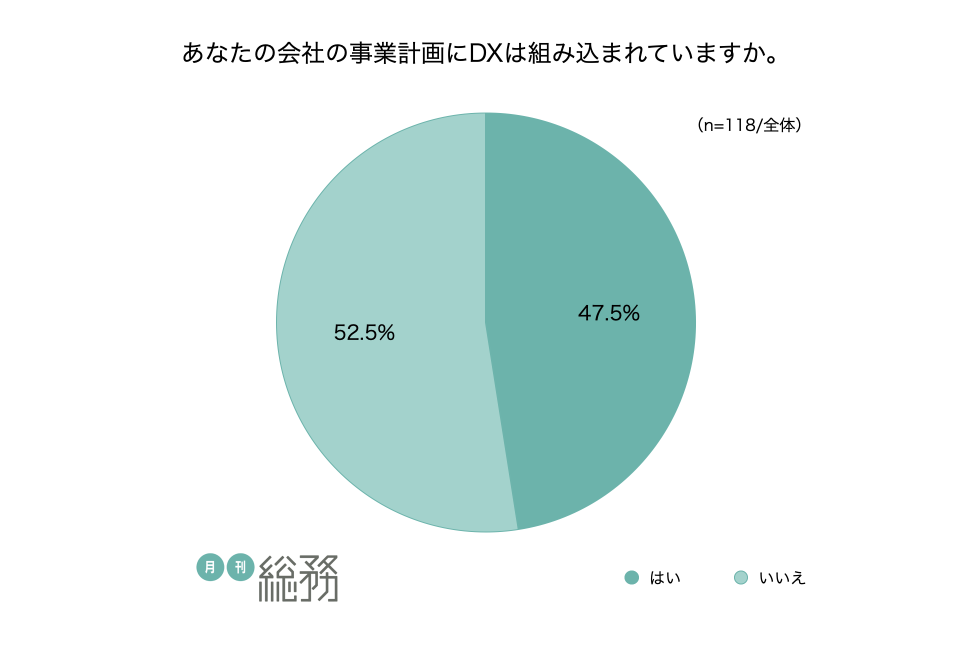 日本で唯一の総務専門誌『月刊総務』を発行する株式会社月刊総務(所在地:東京都千代田区、代表取締役:豊田健一)は、全国の総務担当者を対象に「DXに関する調査」を実施し、118名から回答を得ました。